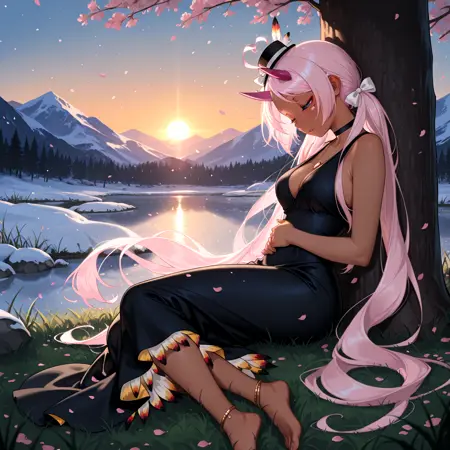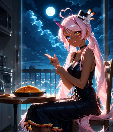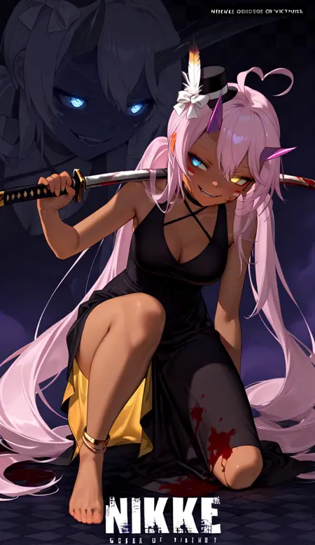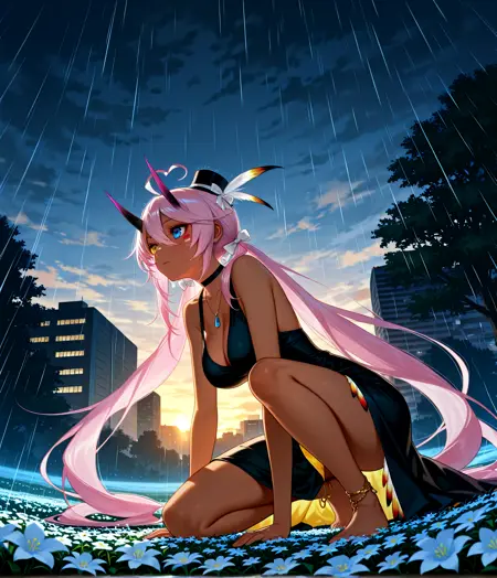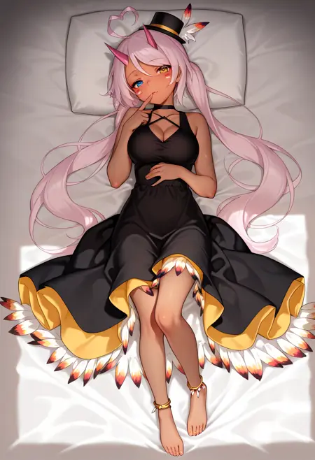 indidress, 매우 긴 머리, 연분홍색 머리, 흰색 리본, 머리 리본, 하트 모양 아호게, 사이드 포니테일, 낮은 트윈테일, 이색안색, 파란 눈, 오니 뿔, 모자 깃털, 짙은 피부, 짙은 피부의 여자, 비대칭 뿔, 미니 탑햇, 깃털 머리 장식, 얼굴 페인트, 중간 크기의 가슴, 검은 색 초커, 소매 없는 드레스, 이-tonal 드레스, 검은 드레스, 노란 드레스, 깊은 V넥, 가슴 절개, 깃털 테두리, 다채로운 깃털, 발목 고리, 벌거숭이 발,