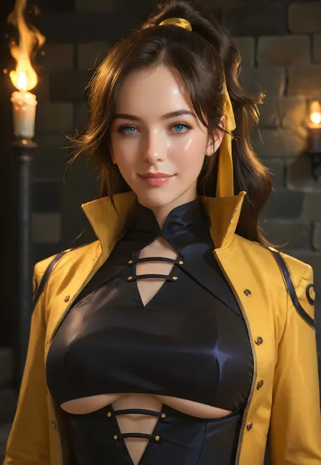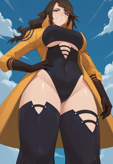 | トレーニングワード | ves, 1girl, long_hair, brown_hair, blue_eyes, pale_skin, large_breasts, hair_bow, ahogeコピーしました! yellow_coat, long_coat, black_leotard, breast_cutout, strappy_leotard, highleg, black_gloves, thighhighs, garter_straps, high_heels, yellow_and_black_footwearコピーしました! |