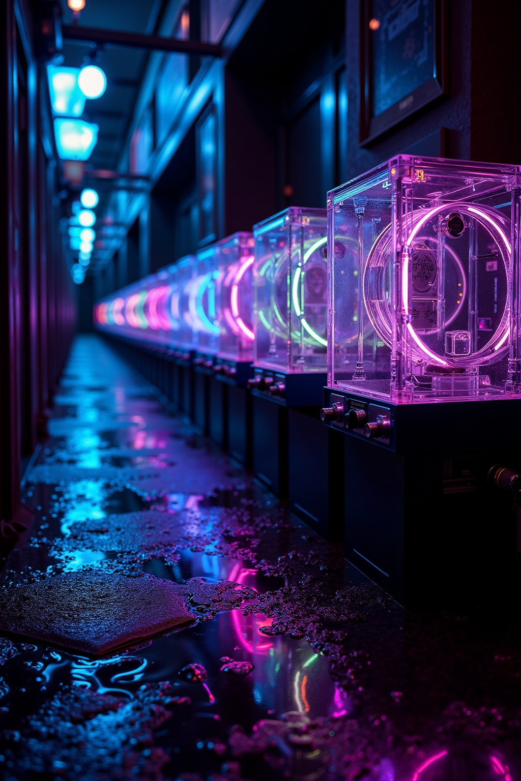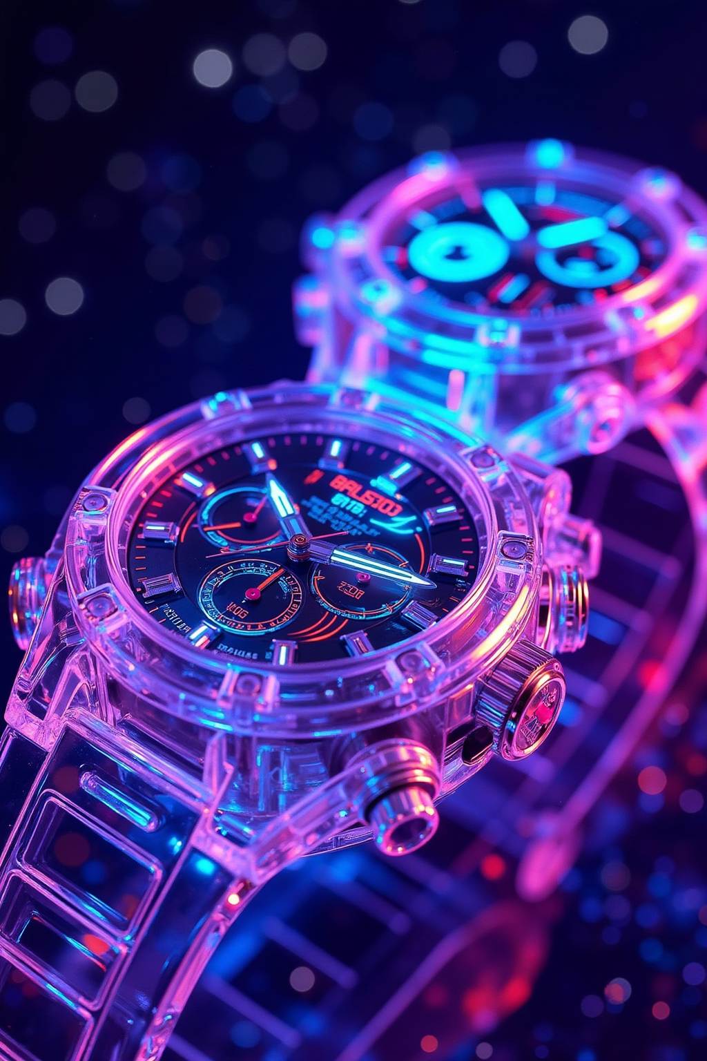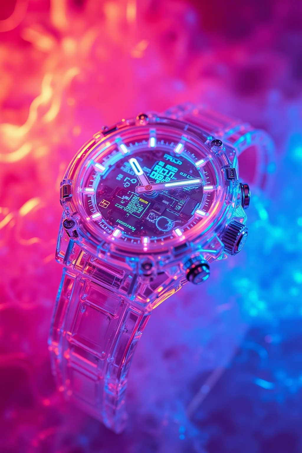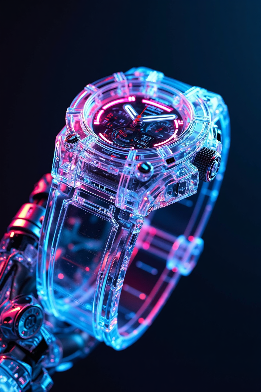 ベースプロンプト: ネオンライトの透明な時計ケース
