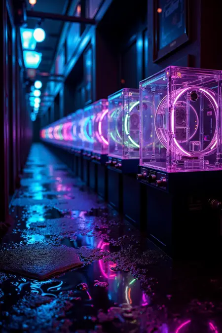 7. ネオンライトの透明な時計ケース、雨に濡れた路地で、濡れた地面にネオンの反射、ノワールな雰囲気、ドラマチックなムード。