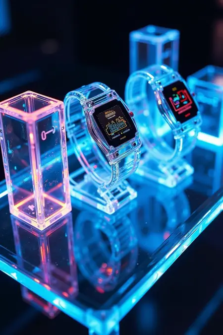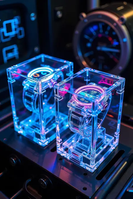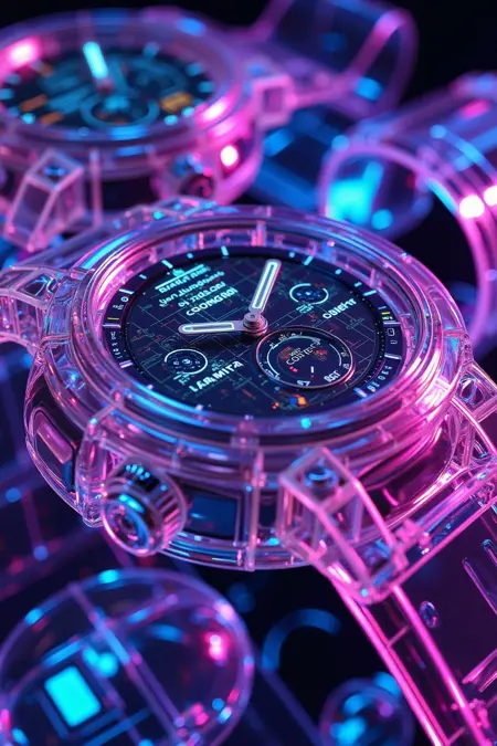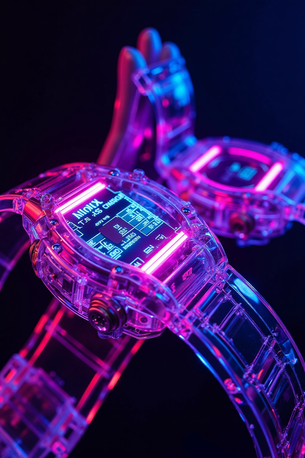 2. ネオンライトの透明な時計ケース、ガラスのテーブルの上、反射効果、柔らかなアンビエント光、ミニマリストな設定、ハイテクな優雅さ。