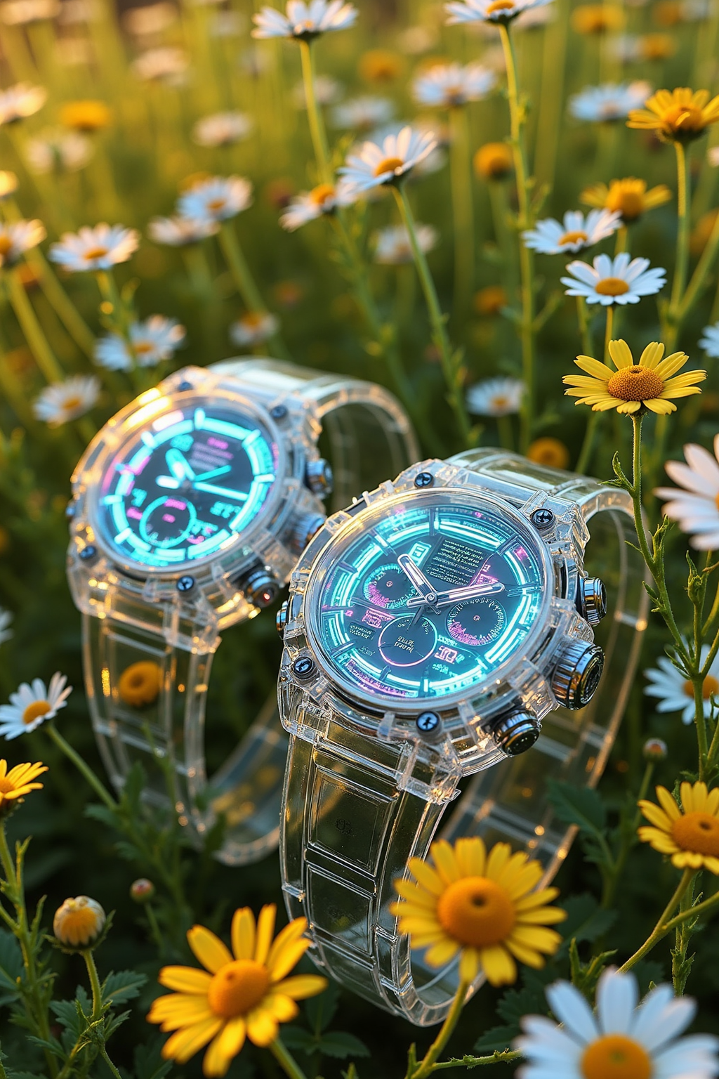 9. ネオンライトの透明な時計ケース、花が咲く牧場の上、自然とテクノロジーのコントラスト、柔らかな日差し、シュールなタッチ。