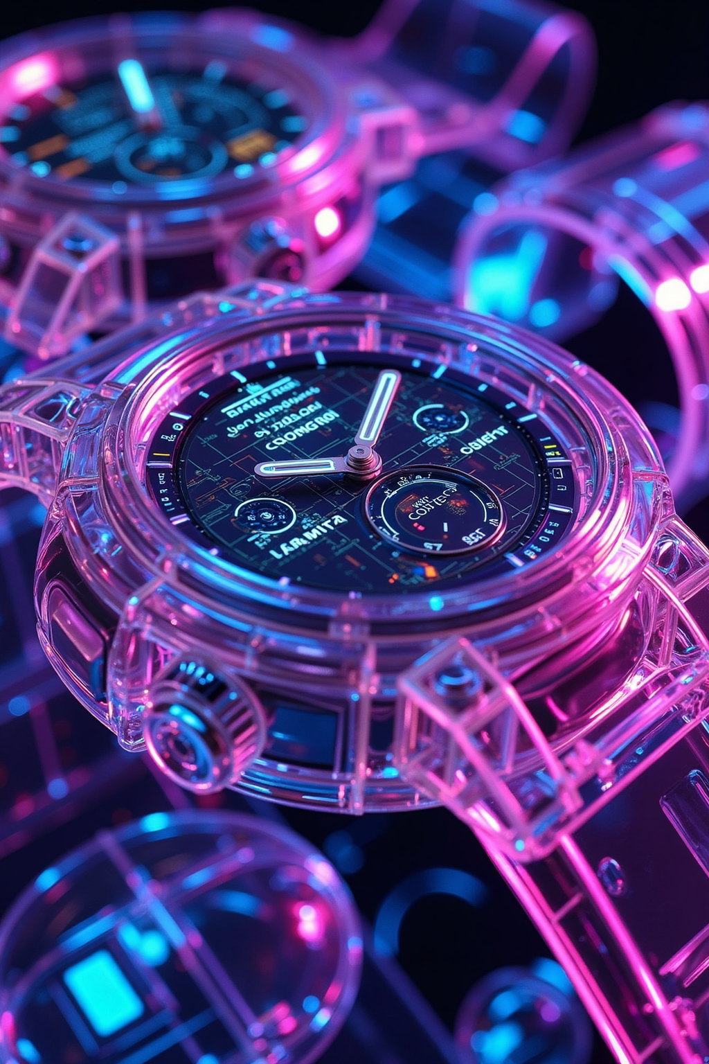 1. ネオンライトの透明な時計ケース、サイバーパンク都市の背景、内部に輝く回路、ダイナミックな角度、超詳細な質感、未来志向の雰囲気。