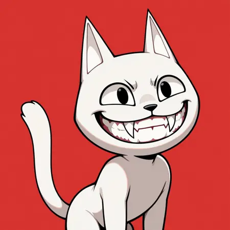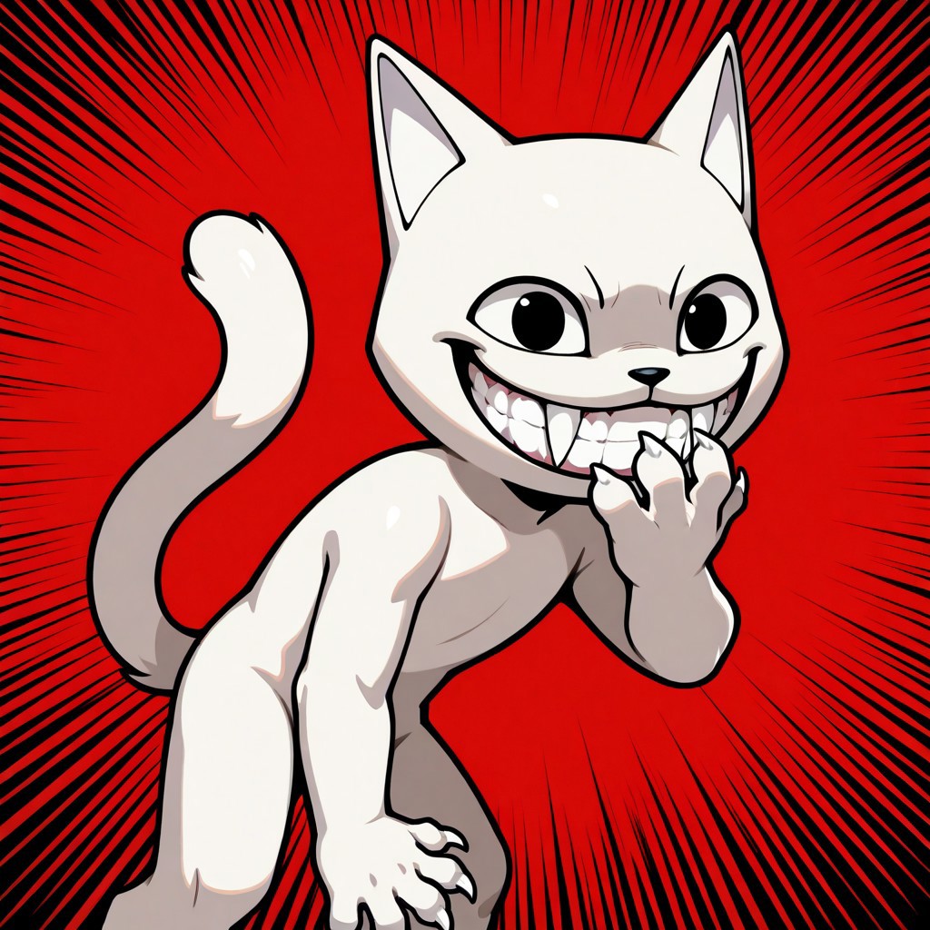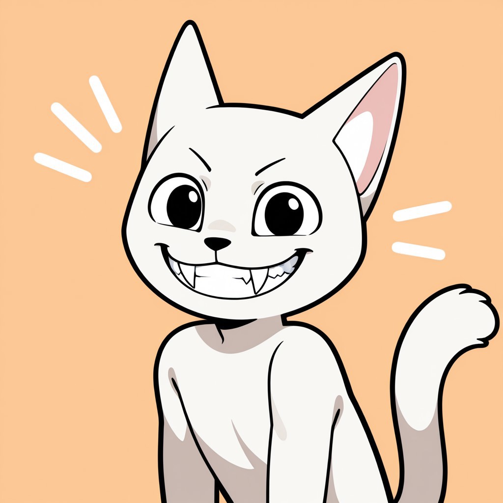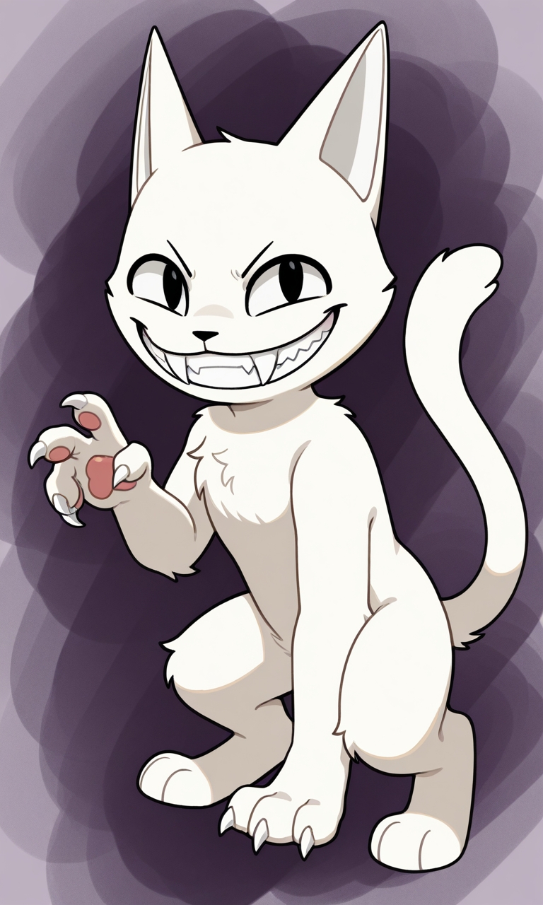 solo, male, anthro cat, white body, black eyes, two fangs, teeth, big smile, grin, cat tail, Open eyes, black nose, white inner ears, without eyebrows, michievous expression