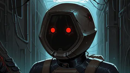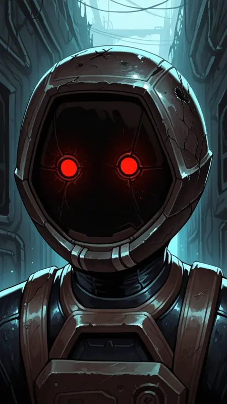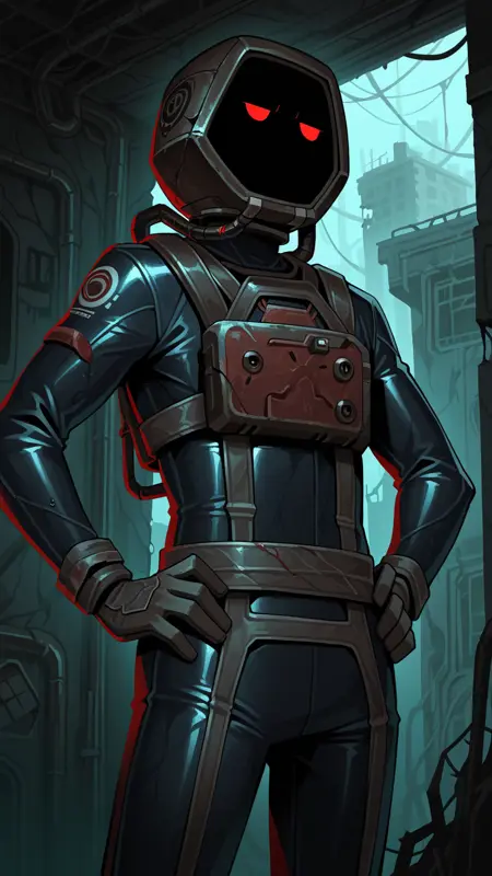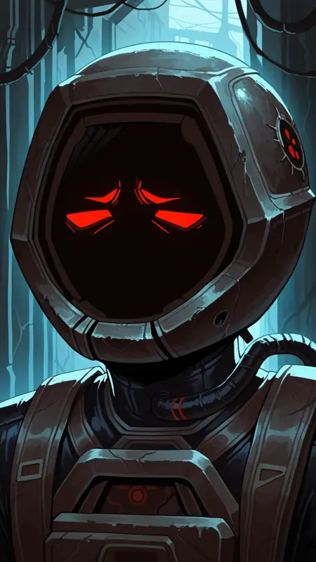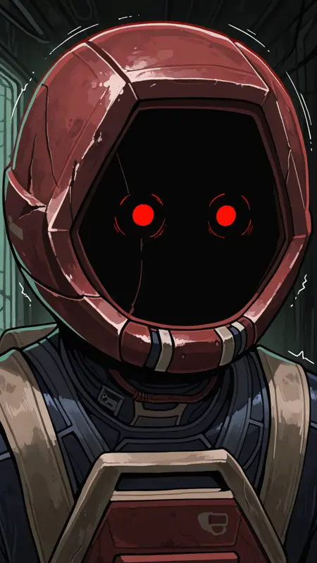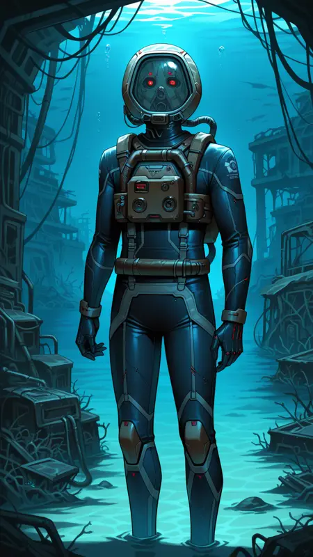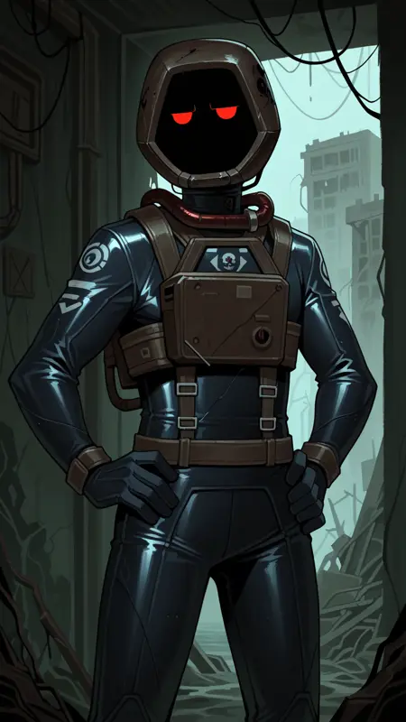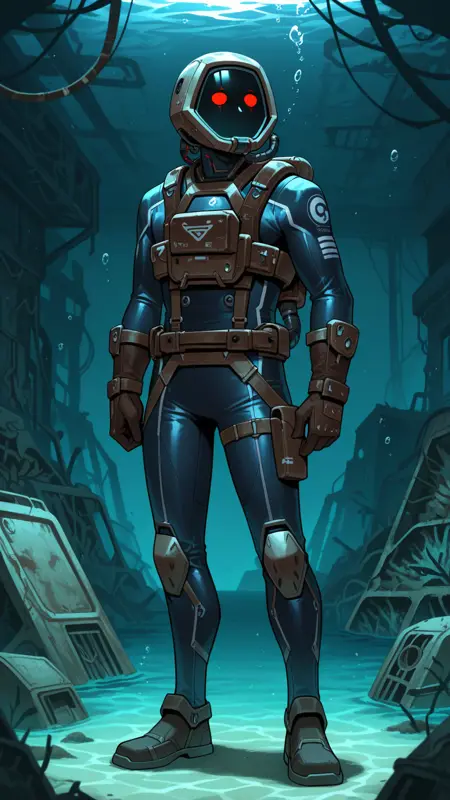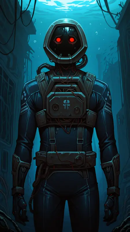 SimonJarrett, 1male, red eyes, face hidden, black screen, diving suit, helmet, no mouth, no eyebrows,