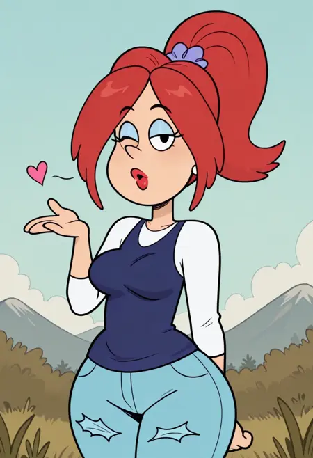 성인 여성, 위장, 밝은 파란색 아이섀도, 빨간 립스틱, 흰색 진주 귀걸이, 긴 빨간 가발, 폰티테일, 보라색 스트런치, 흰색 긴소매 셔츠 위에 입은 파란색 민소매 상의, 큰 가슴, 하늘색으로 찢긴 청바지, 넓은 엉덩이, 보라색 액센트와 노란 밑창이 있는 흰색 스니커즈