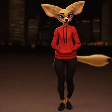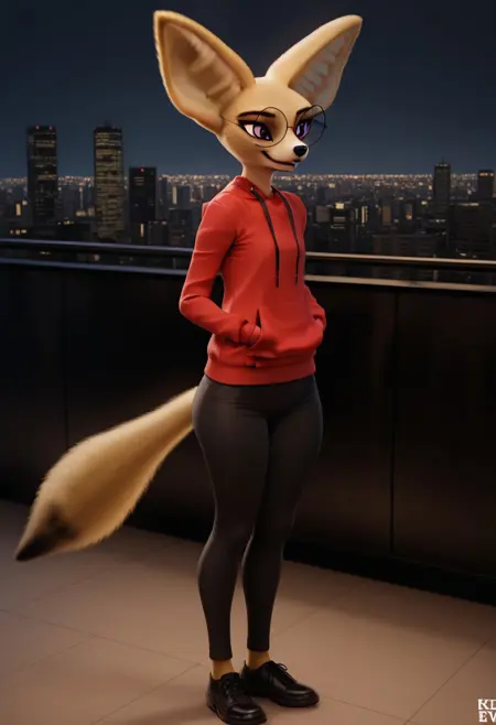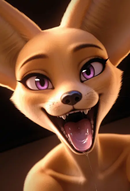 fox, fox girl, fennec fox, tan fur, purple eyes, black nose, large ears, fox tail, flat chest,