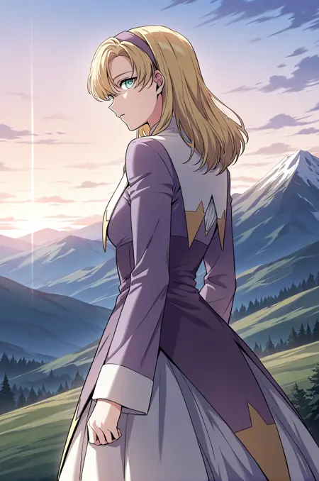 Sona_outfit, purple dress, white high collar, long sleeves, gemstone brooch, purple side panels, purple front panel, pointed patterns, golden trim, white skirt, purple high boots