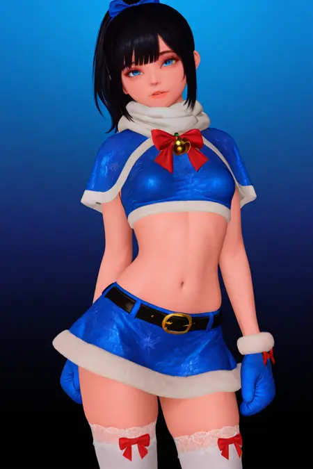 blue crop top,cropped shirt,blue capelet,santa costume,red bow,red bowtie,blue skirt,miniskirt,zettai ryouiki,fur-trimmed skirt,belt,white thighhighs,lace-trimmed legwear,boots,blue footwear,blue gloves,mittens,christmas,white scarf,jingle bell,neck bell,