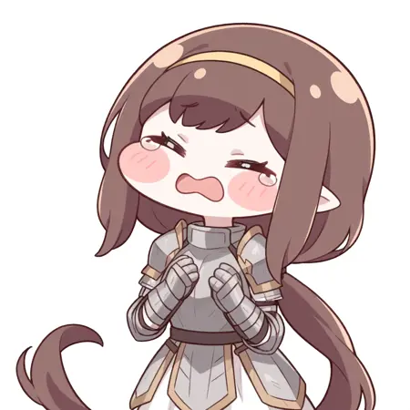 タグ:1人女の子、茶色の髪、長い髪、鎧、ヘアバンド、茶色の目、非常に長い髪、鞘、尖った耳、手甲、装甲ブーツ、低いポニーテール、スカート、ちび、頬紅ステッカー