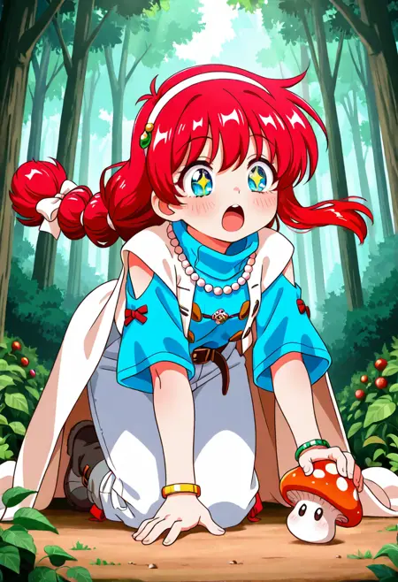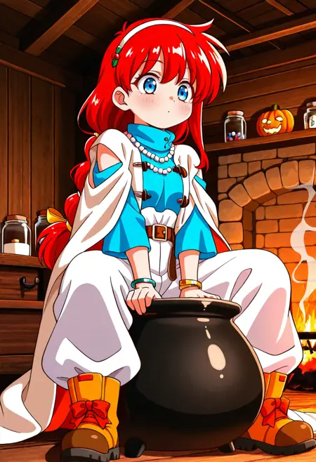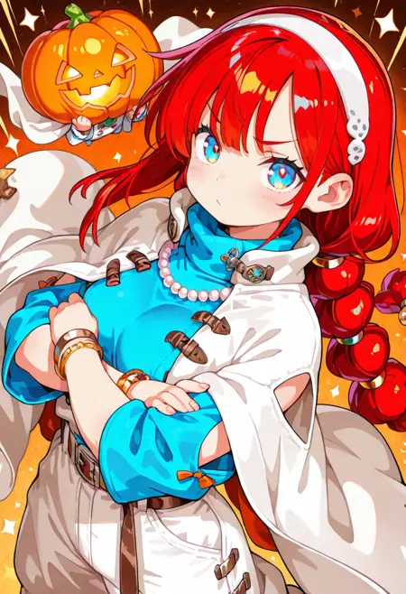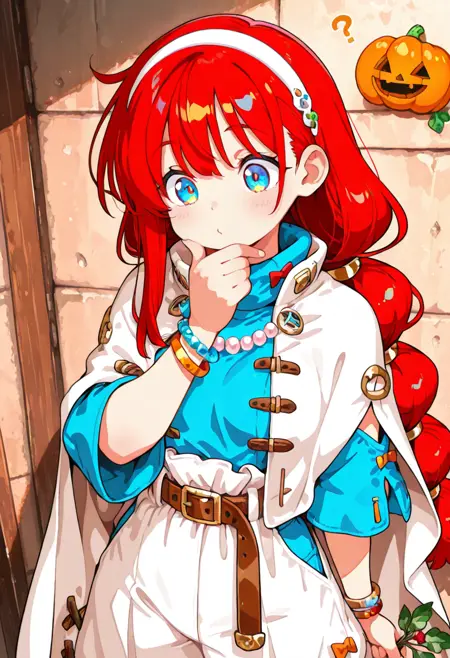 トリガー:berry_mahotsukai、赤髪、片側の前髪、片側の複数結びの長い髪、青い目、かぼちゃのバッジ付き白いヘアバンド、白いマント、((マントの腕切り抜き))、マントのタグ、青いタートルネック短袖シャツ、ブレスレット、かぼちゃのバッジ付き真珠のネックレス、白いルーズパンツ、作業用ブーツ、靴ひも、ベルト