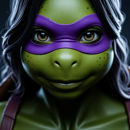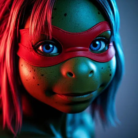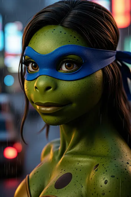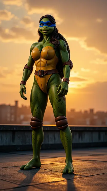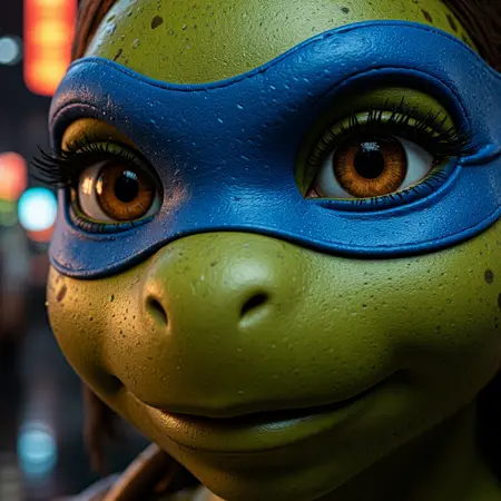 以现代半写实3D美学对少年变异忍者龟进行真实而风格化的重构。这些女性形象融合了人类形态与爬行类结构——纹理化的绿色皮肤、鲜明的面部个性,以及标志性的棕色背甲自然融入其身体结构。双手保留三指加一拇指的设计,这是有意为之,既保留了混血特征,又确保了功能性的真实感。