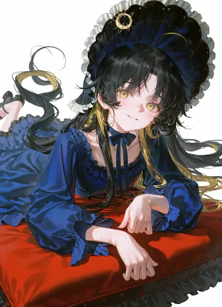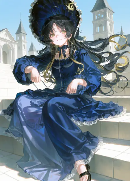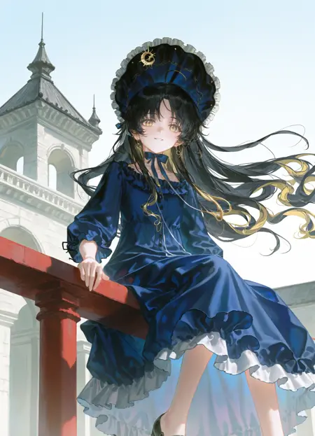 xinyueye,1girl,solo,blonde hair,black hair,long flowing hair,floating hair,parted bangs,ahoge,yellow eyes,blue dress,long dress,frilled dress,long sleeves,sleeves past elbows,frilled bonnet,chin strap,blue bowtie,crescent hair ornament,jewelry