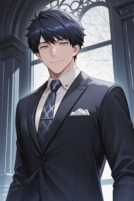 adult, blue hair, black hair, grey eyes