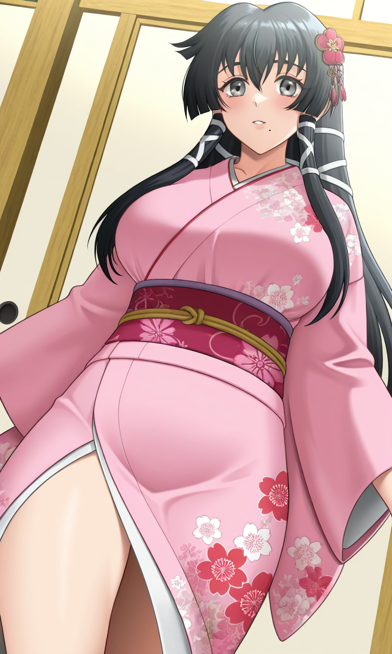 Furinji Shizuha (Shijou Saikyou No Deshi Kenichi), black hair, grey eyes, thick tighs, collarbone, hair ornament, mole under mouth, large breasts, long hair, Hime style, short bangs down to the cheeks, framing the sides of the face, a few strands hanging between the eyes, thick strands in front of the ears, long pink floral kimono