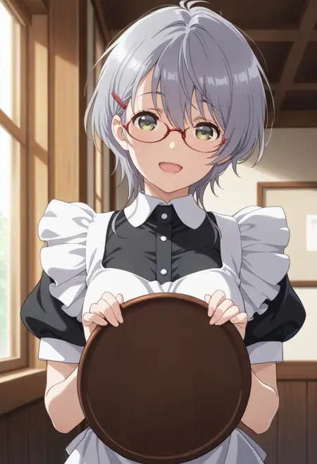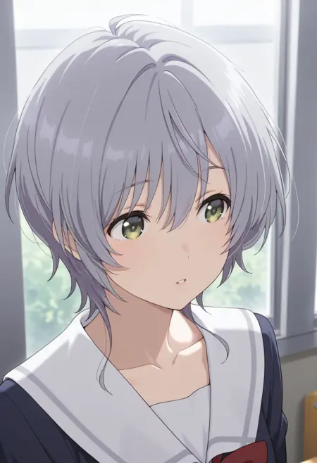 触发词:kikuchi fuuka,灰发,短发,绿眼睛