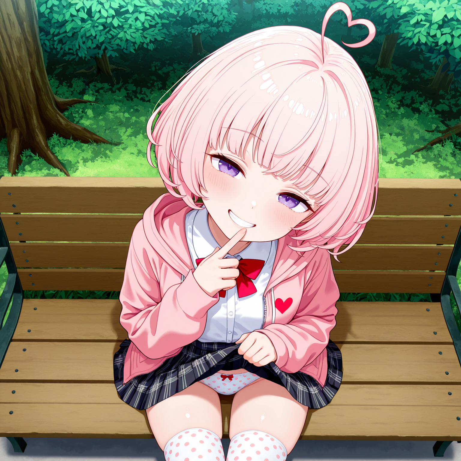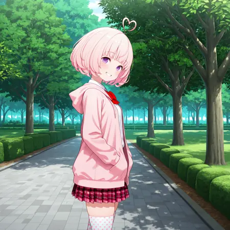 - YOKOIYUZUHA, 1girl, 보라색 눈, 분홍색 머리, 단발, 하트 모양 ahoge, 하트 무늬 폴카닷 허벅지 양말, 체크 무늬 스커트, 분홍색 후드 재킷, 흰색 셔츠, 빨간 리본, 후드 아래로, 작은 가슴,