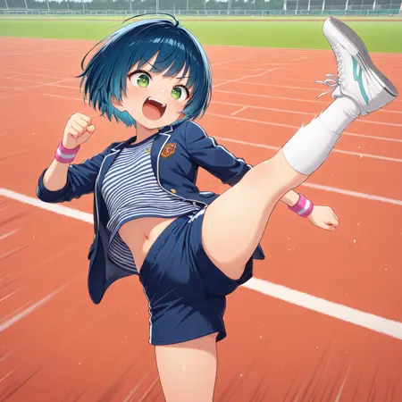 - UMEDAYUURI, 1girl, 파란색 머리, 녹색 눈, 단발, 줄무늬 셔츠, 양말, 스니커즈, 반바지, 팔찌, 재킷, 작은 가슴,