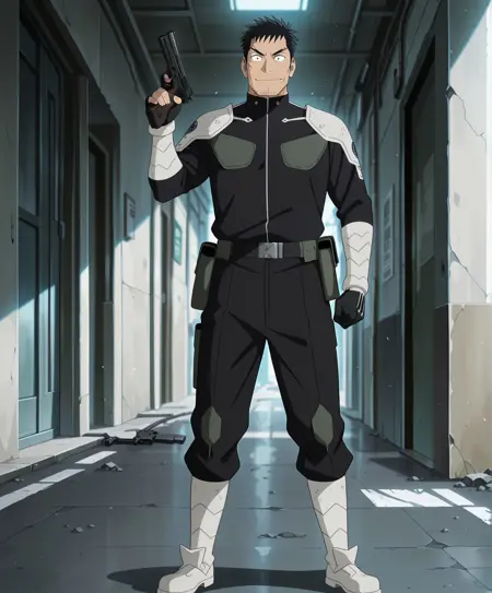 1boy, solo, male focus, weapon, gun, black hair, mature male,