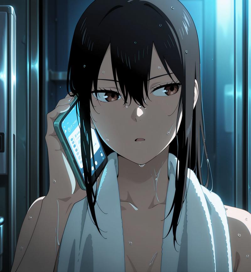 1girl, solo, black hair, towel, towel around neck, bathroom,brown eyes,
