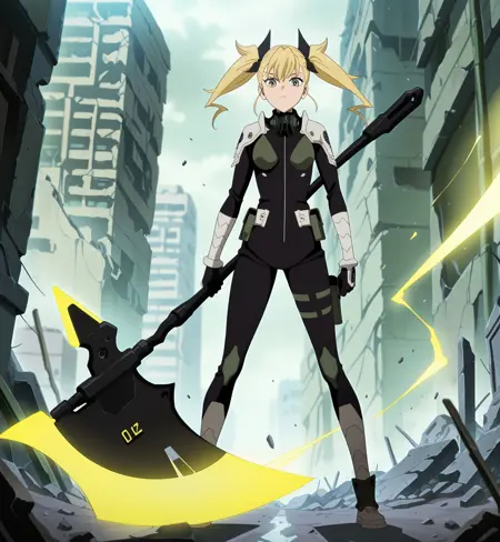 bodysuit, holding weapon, k_kikoru,huge axe,weapon,