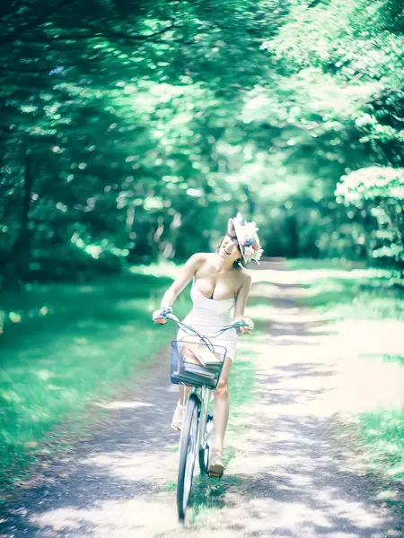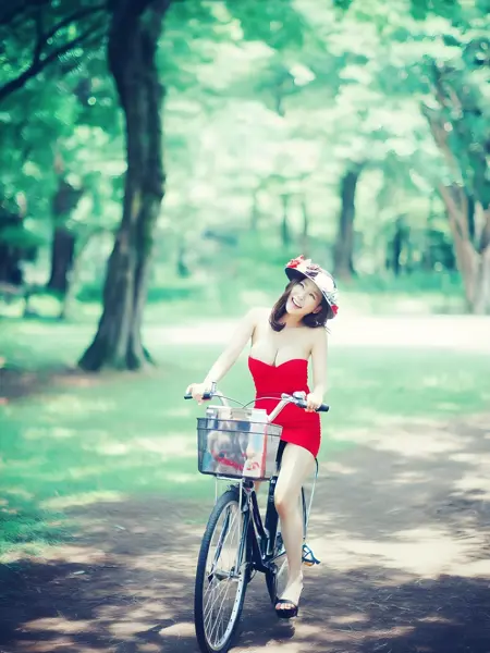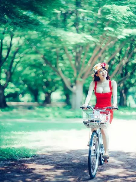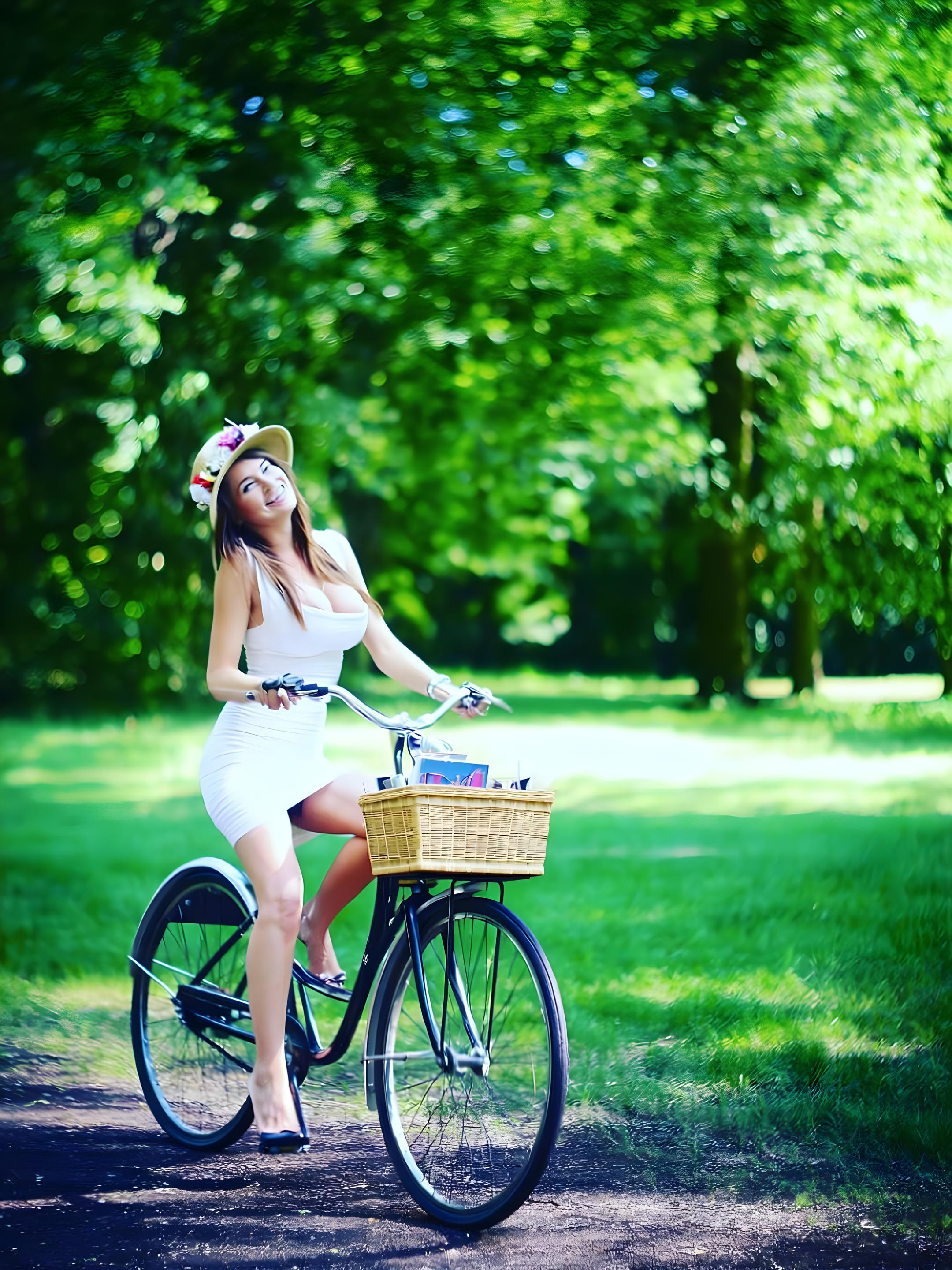 一位非常漂亮的韩国女性骑着自行车,身穿白色连衣裙,胸部丰满,皮肤白皙,头戴装饰有花朵的帽子。她面带微笑,回头望着镜头,显得非常开心。自行车前篮里装有一些物品,可能是书籍或小物件。背景是一片郁郁葱葱的树林,阳光透过树叶洒落在地面上,形成斑驳的光影。整个场景充满了夏日的清新与宁静,给人一种悠闲自在的感觉。女性的姿态和表情传达出轻松愉快的心情,仿佛正在享受一个美好的午后时光。