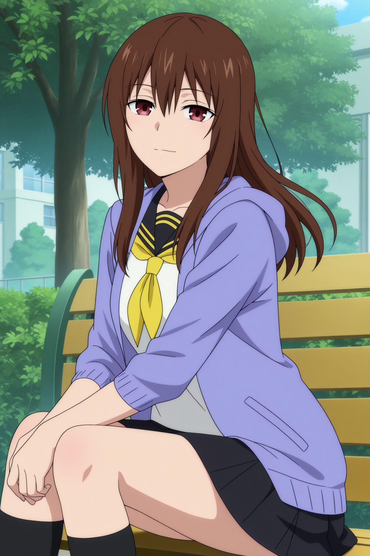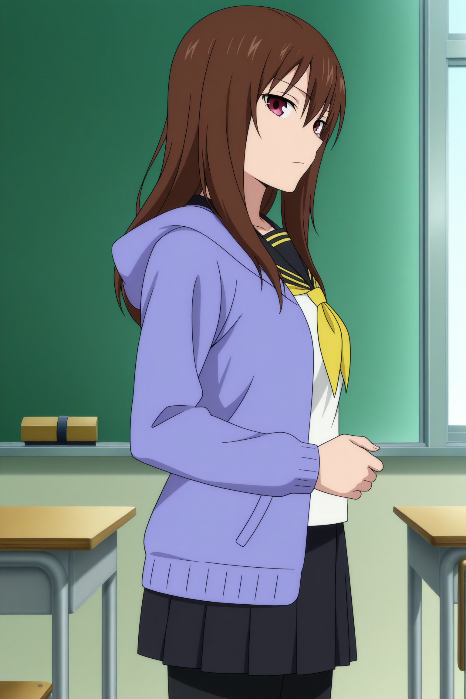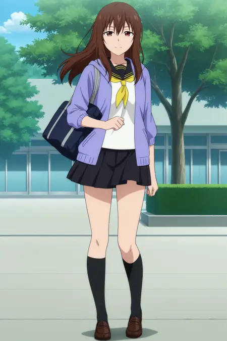 早乙女风香,长发,棕色头发,参差不齐的刘海,红眼睛,四分之三袖,连帽外套,紫色连帽衫,敞开式连帽衫,白衬衫,黑色水手领,黄色领巾,黑色裙子,百褶裙,黑色袜子,过膝袜,棕色鞋子,乐福鞋