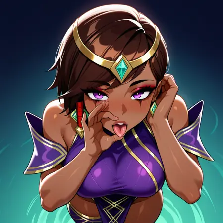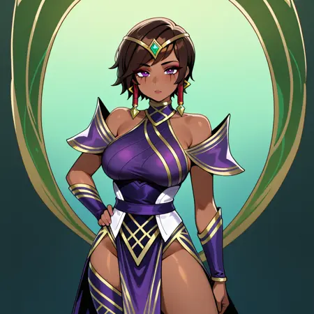 | 학습된 단어 | lolkarma, 1girl, solo, large breasts, makeup, mature female, purple eyes, dark-skinned female, brown hair, short hair, hair tubes, earrings, jewelry, tiara, bare shoulders, purple dress, pelvic curtain, purple thighhighs, single thighhigh복사됨! |