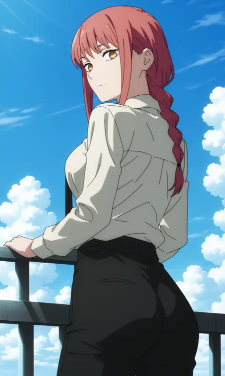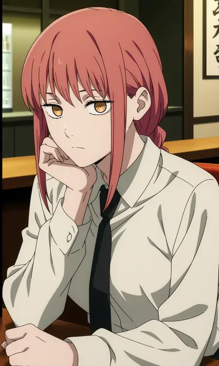 Makima, ringed eyes, red hair, braided ponytail, bangs, yellow eyes, sidelocks, medium hair, long hair,
