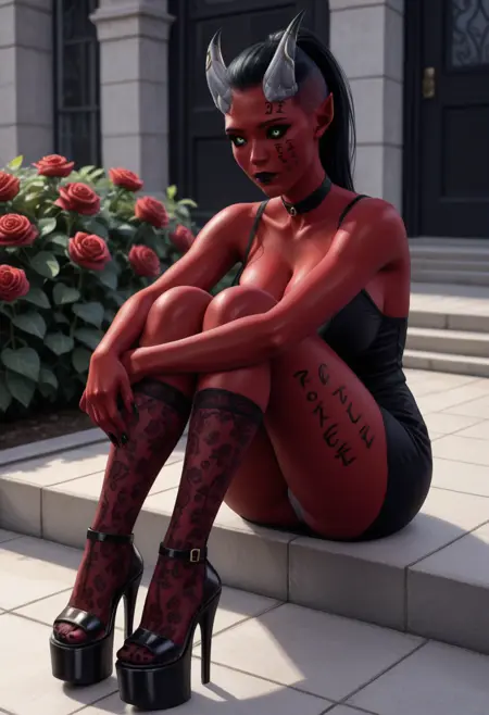 BGMyDreamGirl, 1girl, demon horns, red skin, demon girl, green eyes, black sclera, black hair, ponytail, body writing, sidecut, pointy ears