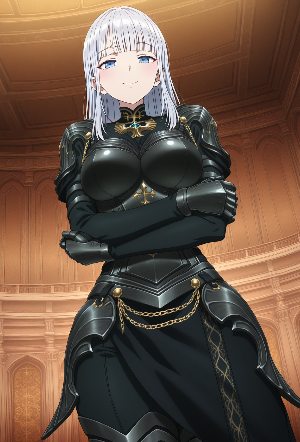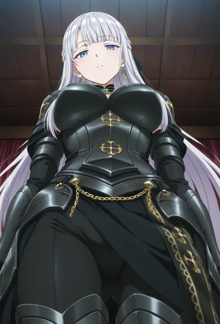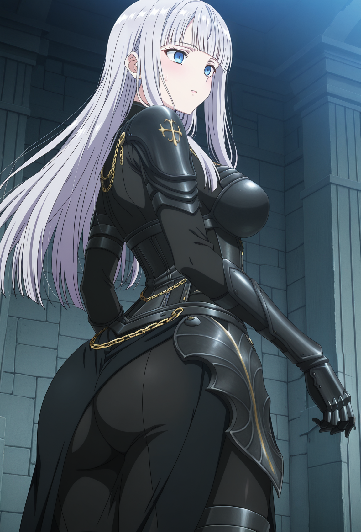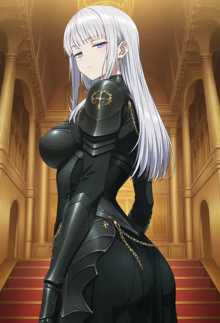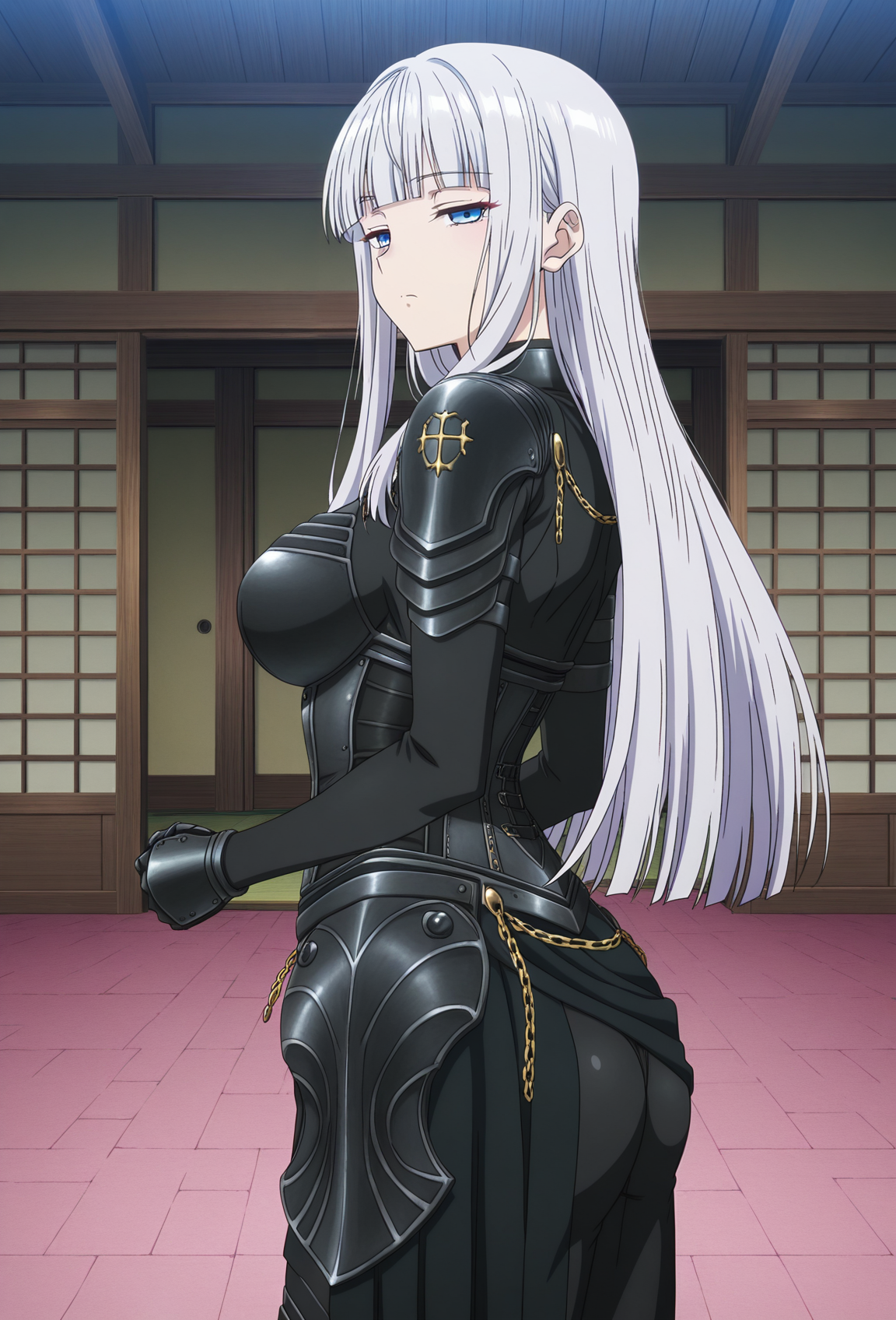 lynn_(ge)、成熟した女性、ミルフ、大きな胸、大きなお尻、銀髪、長い髪、青い目、ストレートな前髪、黒い鎧、パウルドロン、ゴールドの鎖、黒いガントレット、黒いグリーヴ、黒いハーフスカート、