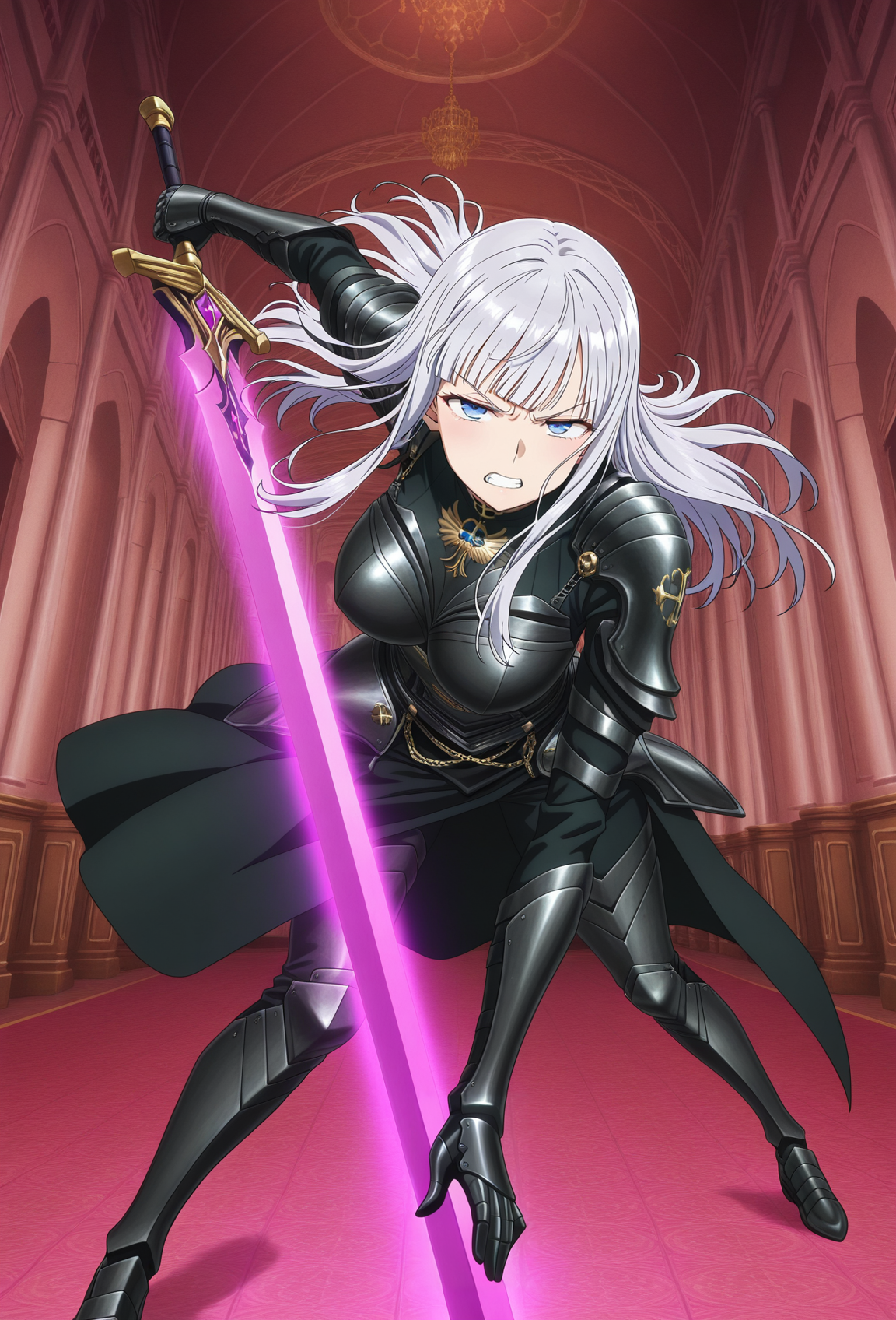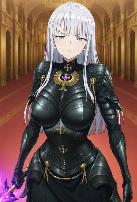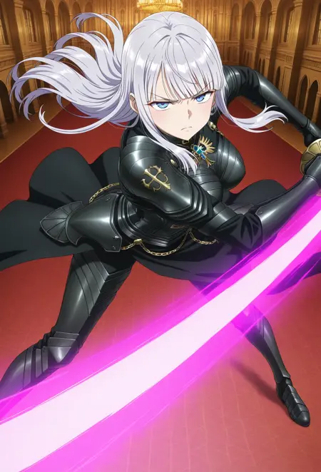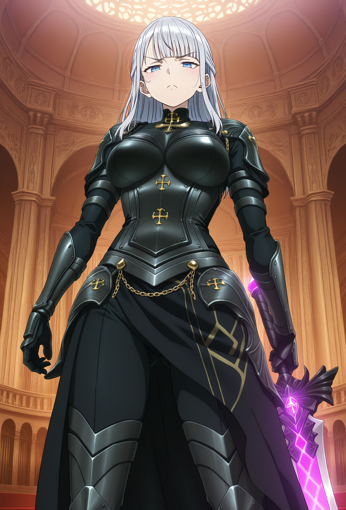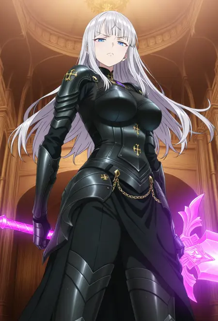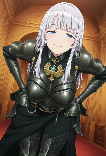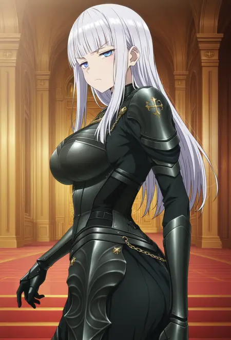 lynn_(ge)、成熟した女性、ミルフ、大きな胸、大きなお尻、銀髪、長い髪、青い目、ストレートな前髪、黒い鎧、パウルドロン、ゴールドの鎖、黒いガントレット、黒いグリーヴ、黒いハーフスカート、