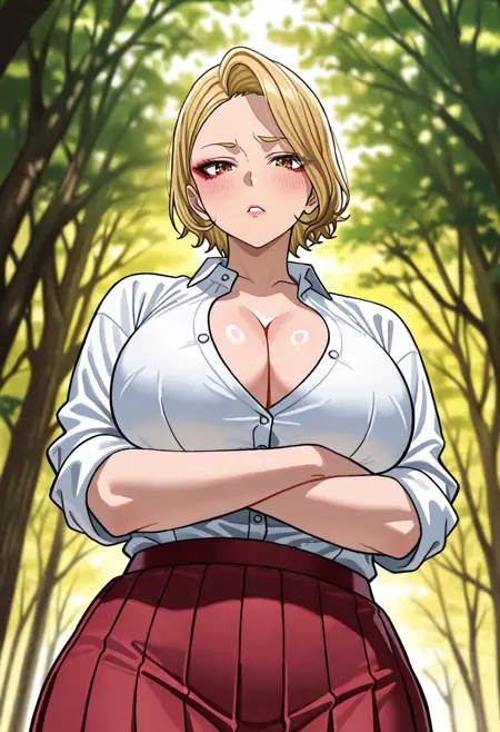 Trigger words: kuinasazanami,blonde hair,brown eyes,curvy,makeup,eyeshadow,short hair,hair behind ear,parted lips,huge breasts.
