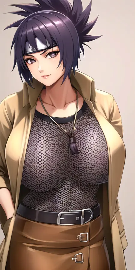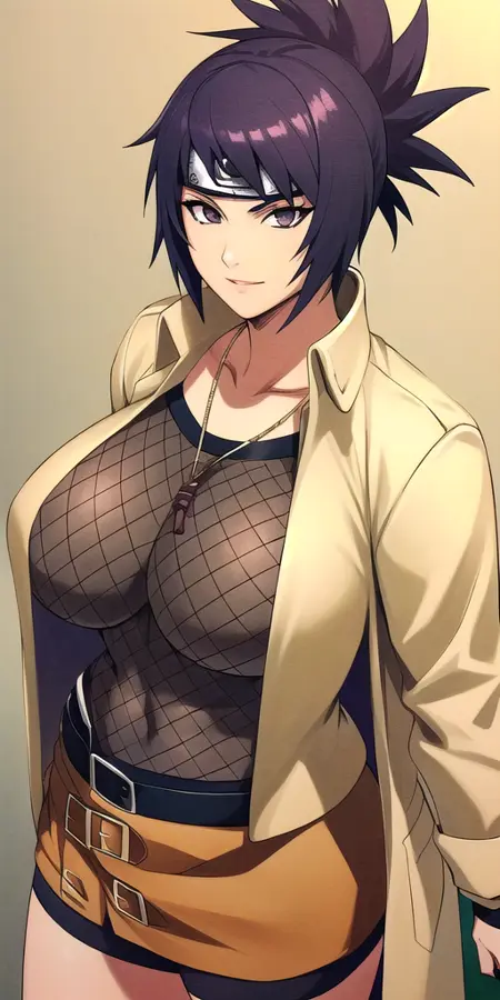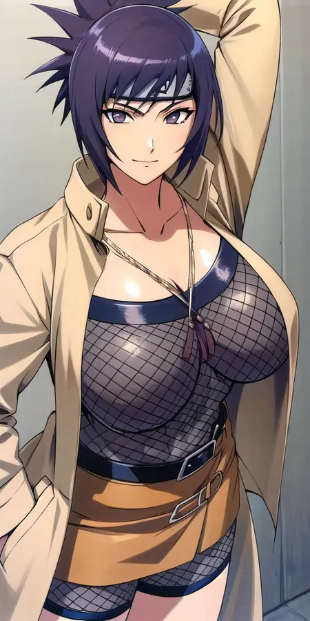 - lora:Mitarashi\_AnkoV3:0.7 mitarashi_anko, forehead_protector, Anko_fishnet_bodysuit_bare_legs_Brown_microskirt_Brown_open_trench_coat