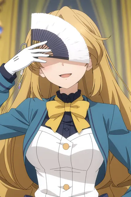 white dress,hair ornament,blue jacket,white gloves,long dress,yellow bow,loafers,white pantyhose,yellow bowtie,