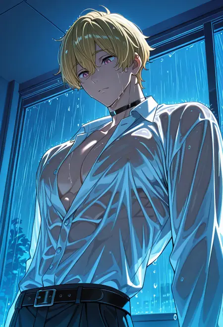 Fr33Nag1saH4zuk1, 1boy, male focus, blonde hair, hair between eyes, purple eyes