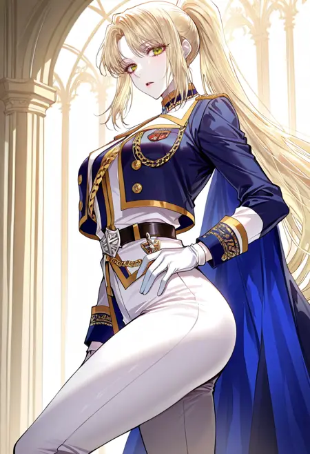 scyllia, blonde hair, green eyes, parted bangs, ponytail, long eyelashes, shiny hair, pale skin,