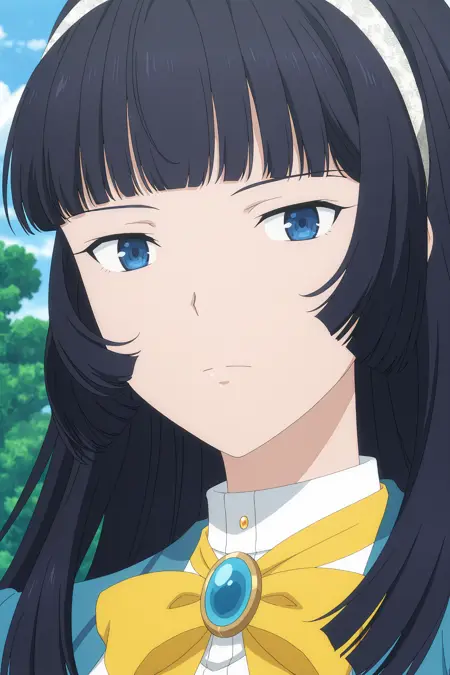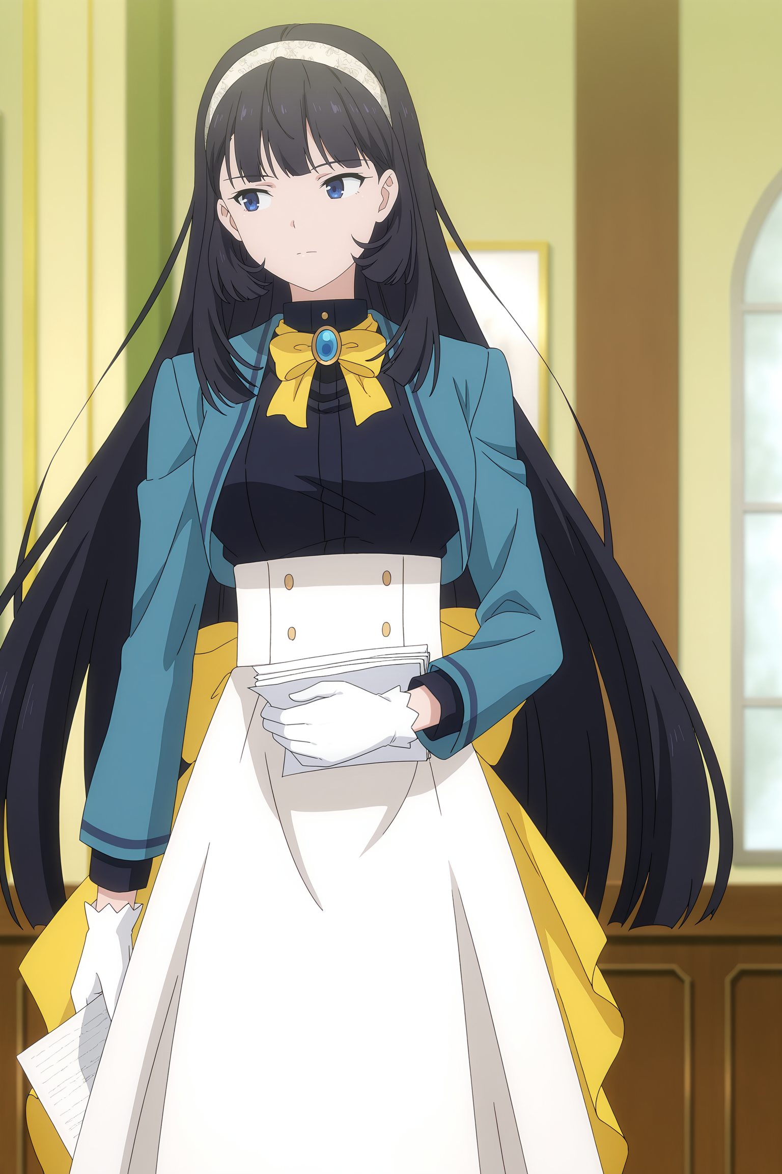 very long hair,hime cut,black hair,white hairband,blunt bangs,