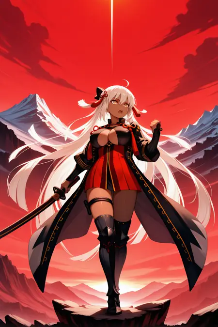 • 오키타 소지 얼터(2단계 상승)에는 "2aosa, 검은 피부를 가진 여성, 흰 머리, 아호게, 노란 눈, 매우 긴 머리, 눈 사이의 머리카락, 검은 리본, 머리 리본, 검은 코트, 높은 목, 테이셀 머리 장식, 검은 코트, 짧은 드레스, 검은 드레스, 빨간 드레스, 이색 드레스, 가슴 노출 컷아웃, 팔 보호대, 검은 티어하이, 허벅지 스트랩, 검은 부츠"를 추가하세요.