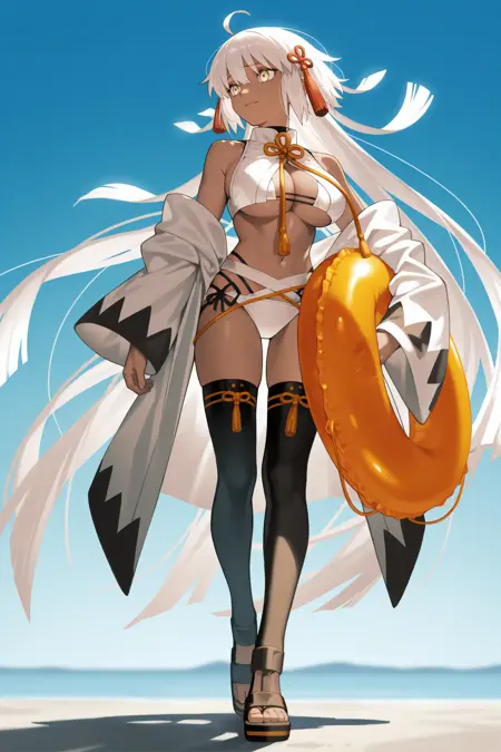 • 오키타 소지 얼터(수영복 세이버)(2단계 상승)에는 "2aossbr, 검은 피부를 가진 여성, 흰 머리, 아호게, 노란 눈, 매우 긴 머리, 테이셀 머리 장식, 흰 하오리, 어깨 노출, 어깨 노출, 넓은 소매, 터틀넥, 목 리본, 가슴 노출, 흰 크롭탑, 흰 수영복, 검은 티어하이, 샌들, 큰 가슴, 붕대 감은 엉덩이"를 추가하세요.