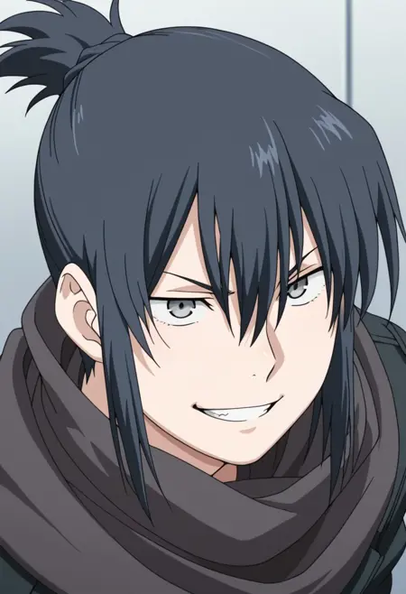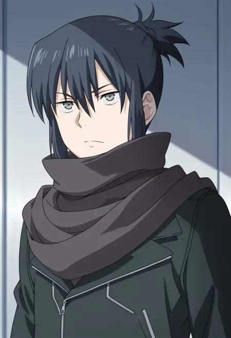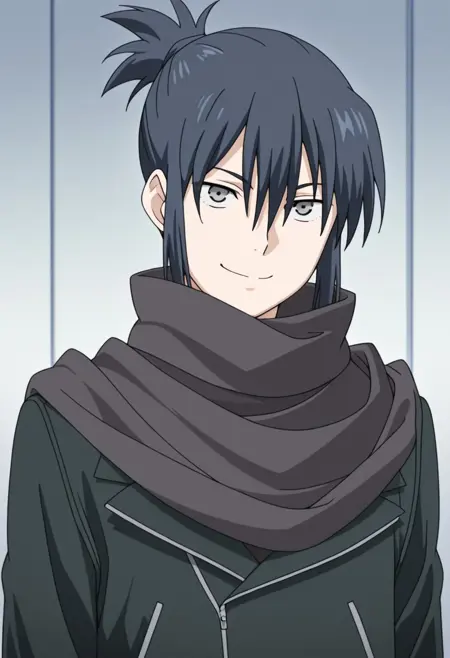 1boy, male focus, solo, grey eyes, black hair, short ponytail, black scarf, black jacket, green shirt, brown pants, boots, black footwear,