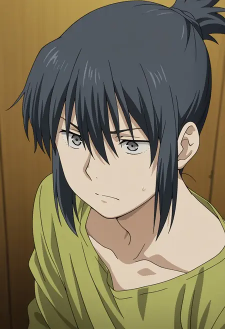 1boy, male focus, solo, grey eyes, black hair, short ponytail, collarbone, green shirt, long sleeves, brown pants,