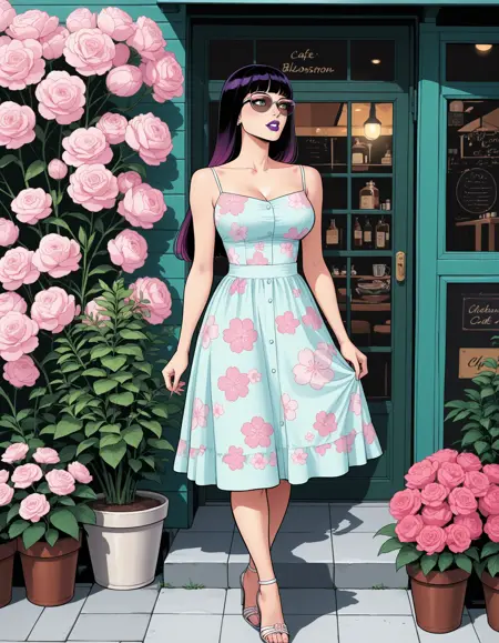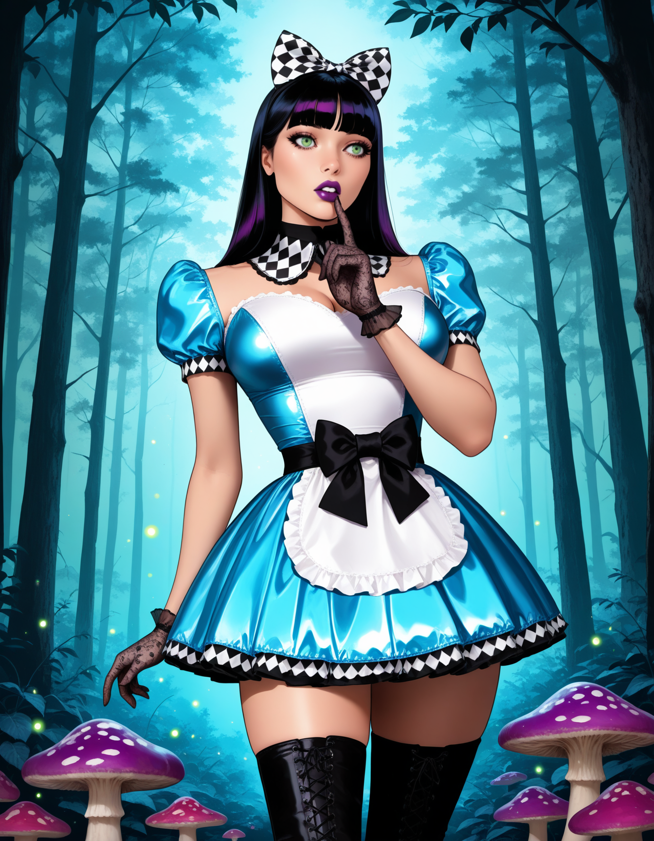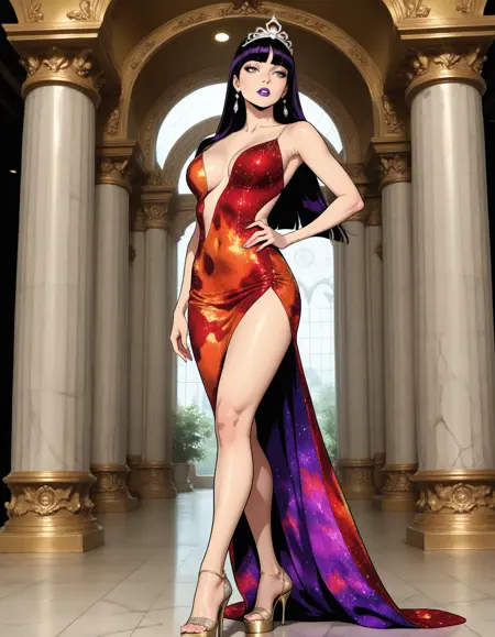 cl4r4, black hair, purple sheen hair, eyelashes, blunt bangs, purple lips, green eyes