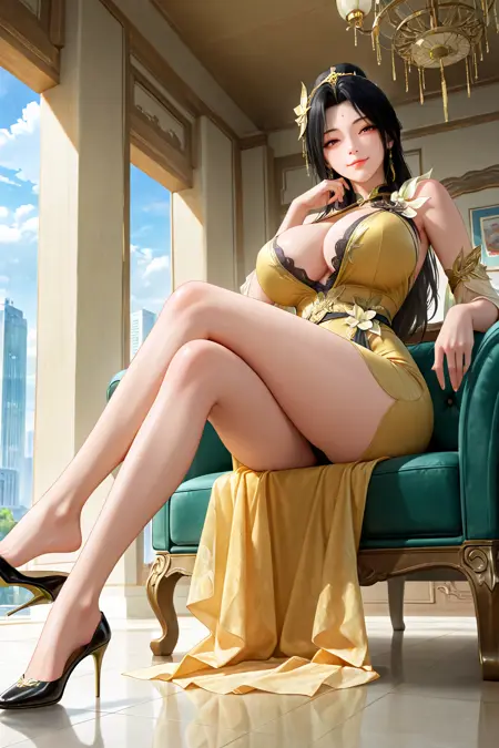 wang xi, long hair, black hair, hair ornament, earrings, jewelry, hair bun, yellow dress, flower