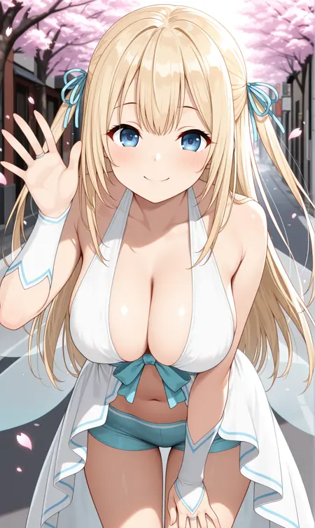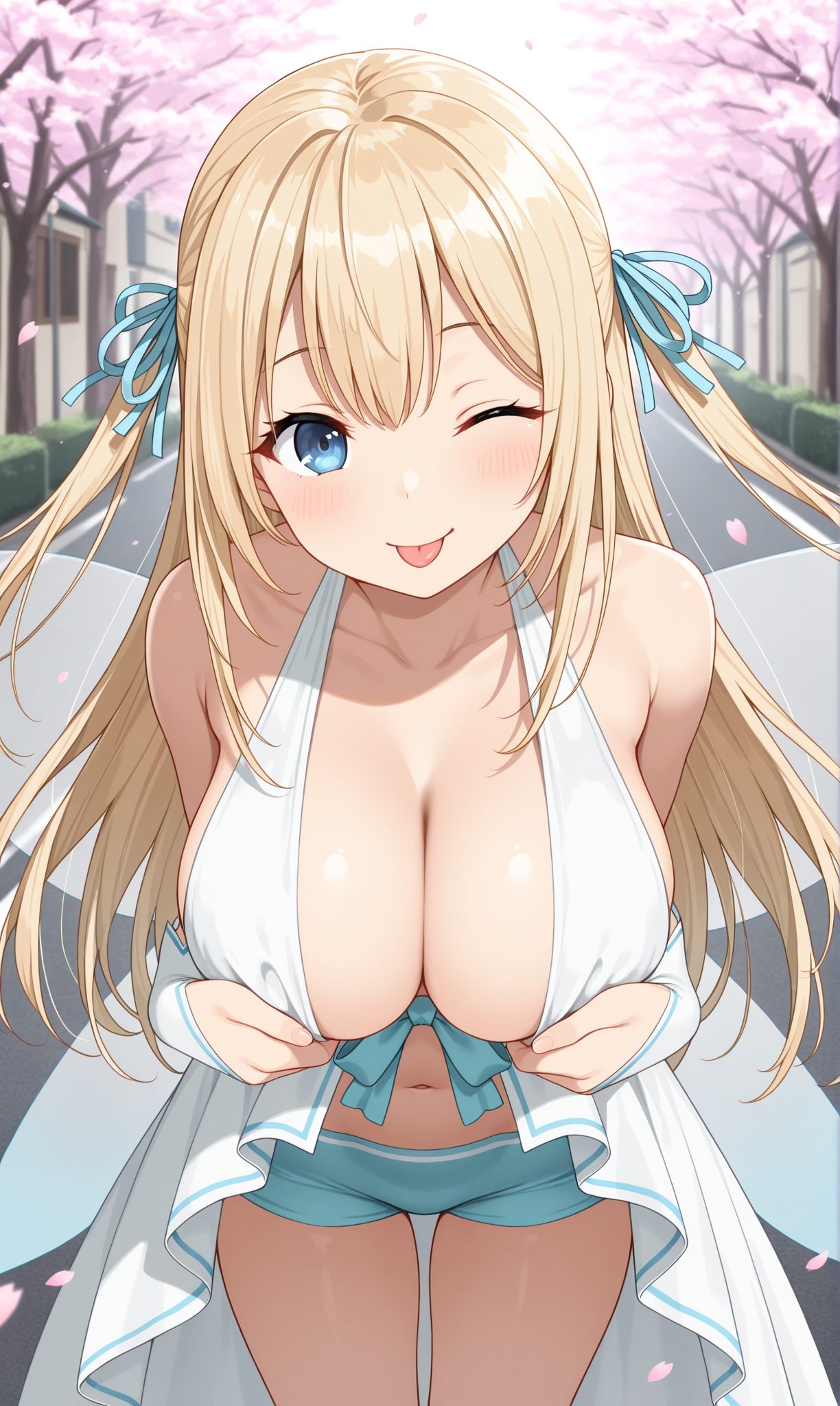 white dress, center opening, blue bow, bridal gauntlets, blue shorts, short shorts, navel