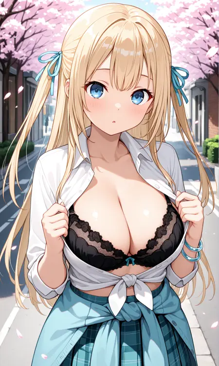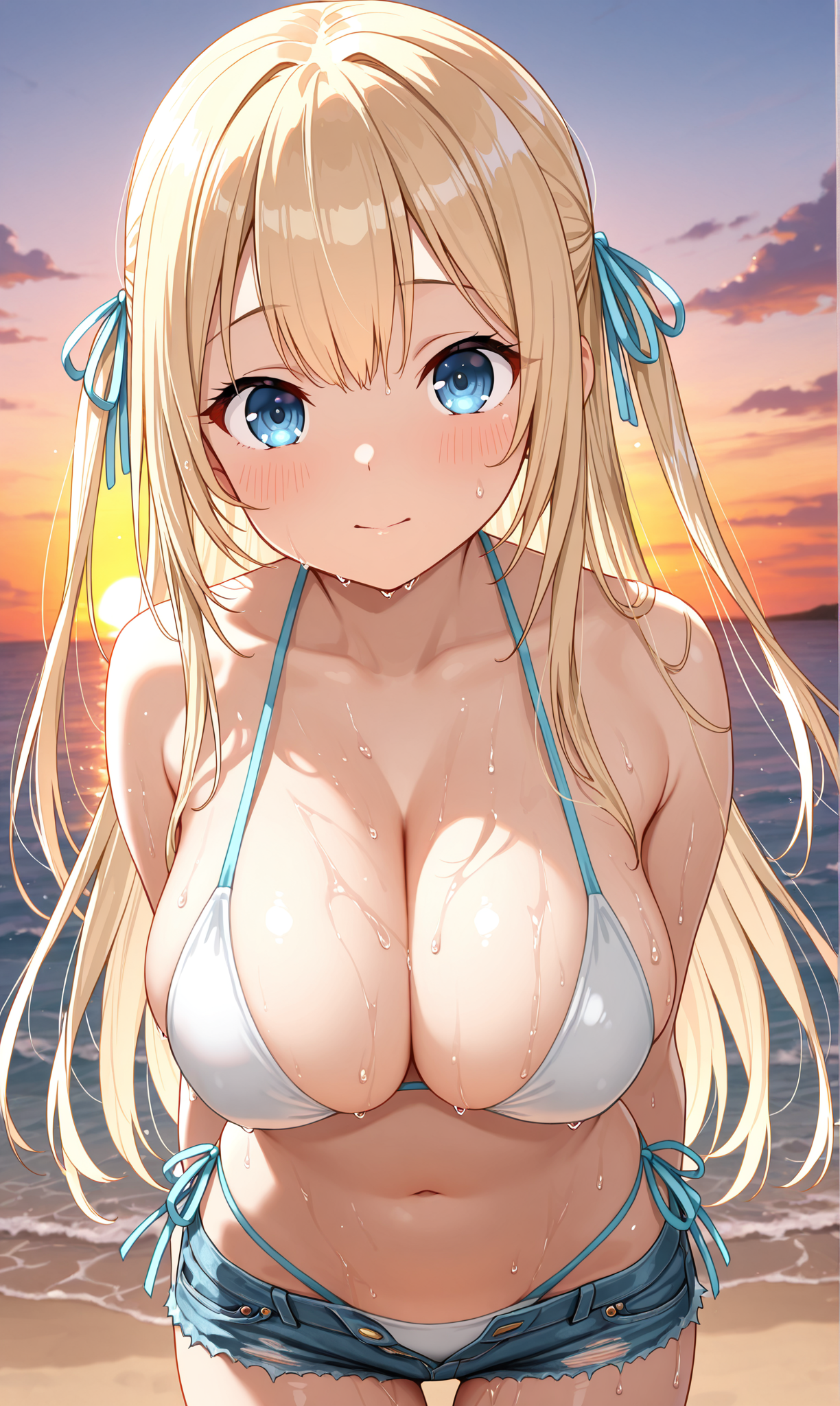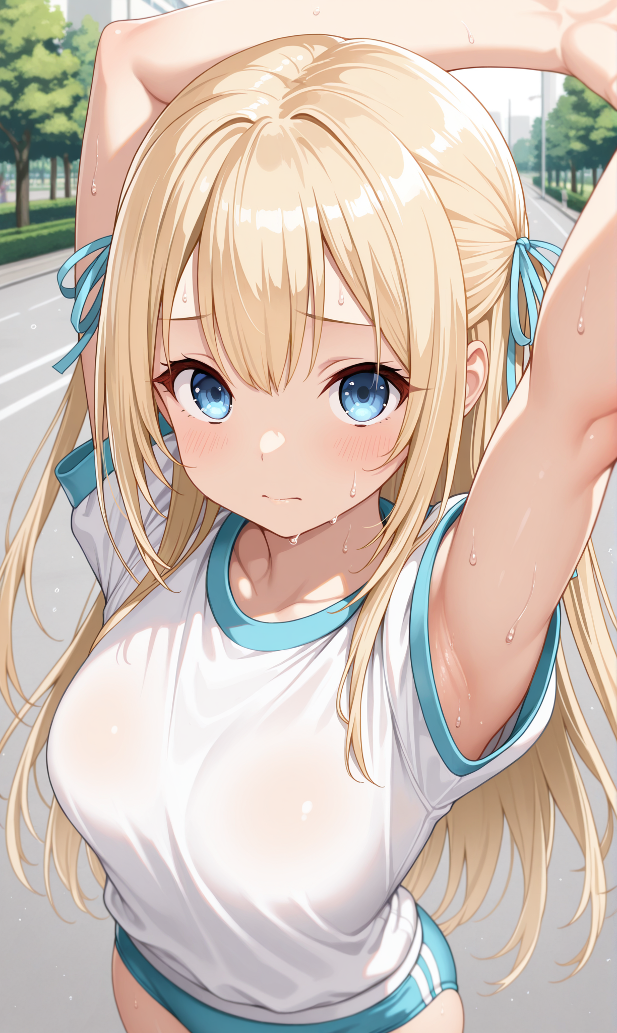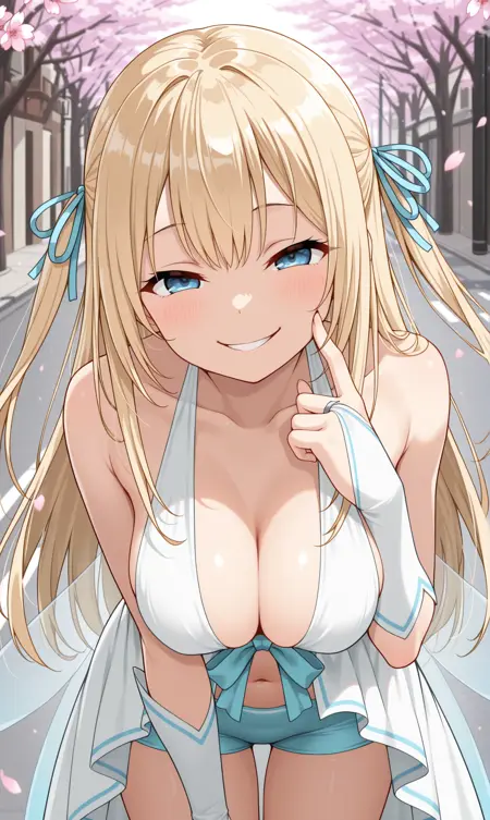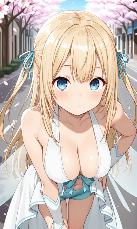 sylphy (amaburi), blue eyes, blonde hair, long hair, two side up, blue ribbon, hair ribbon