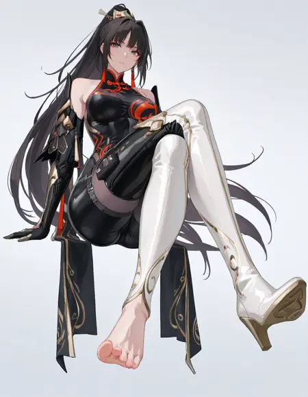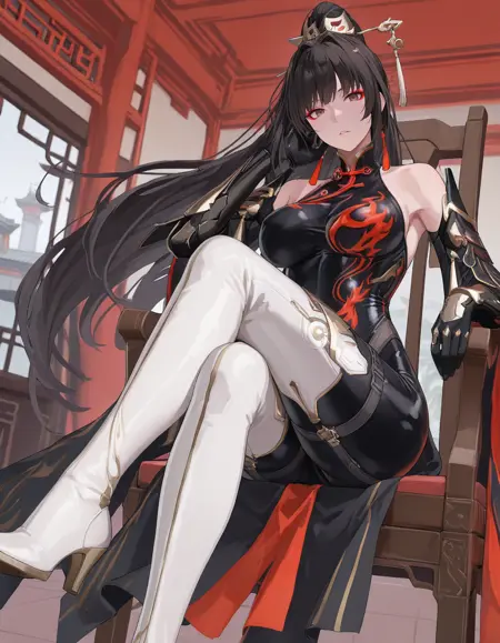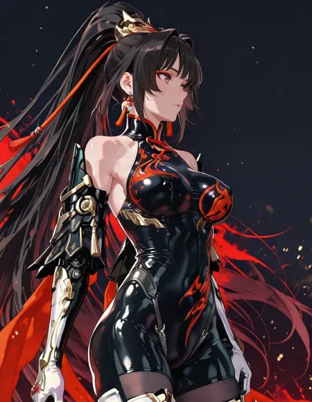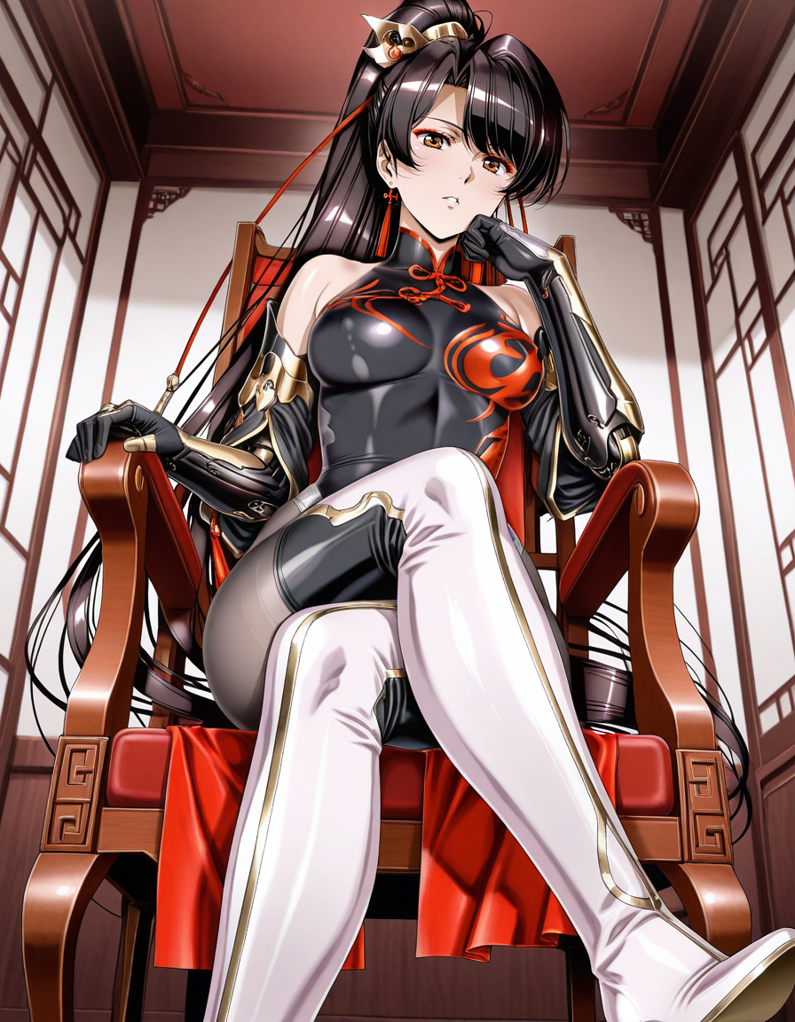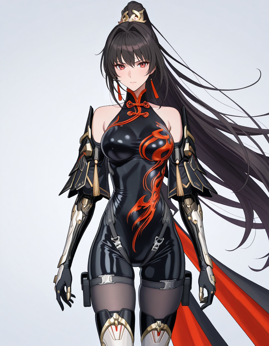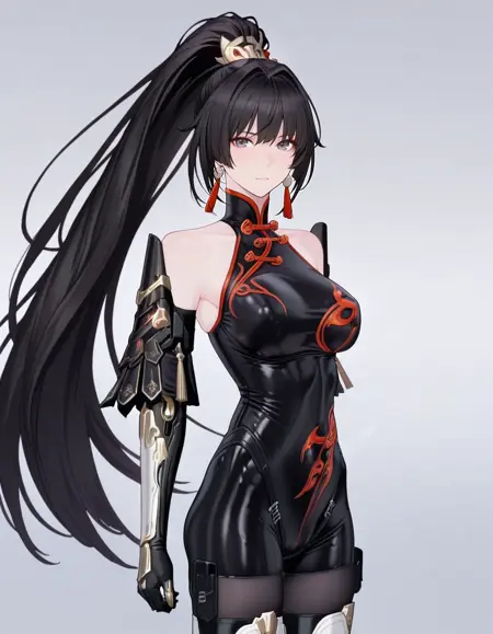 mai_pgr_qu_qm_lqgy,brown_eyes,red_eyeshadow,very_long_hair,high_ponytail,black_hair,mature_female,(aged_up:1.5),hair_ornament,bodysuit,bare_shoulders,gloves,mechanical_arms,pantyhose,boots,black_bodysuit,chinese_clothes,thigh_boots,white_footwear,tassel,gold_trim,holding_sword