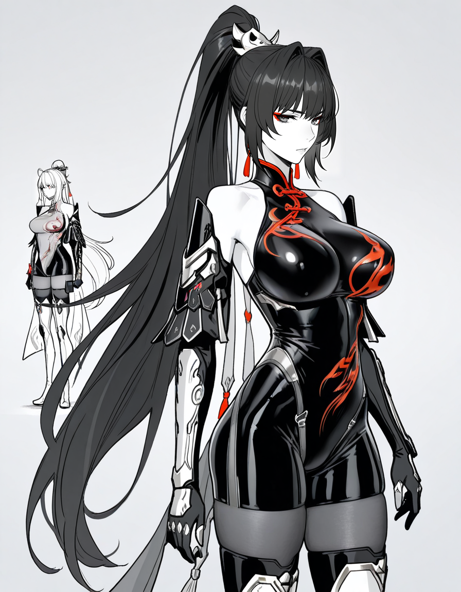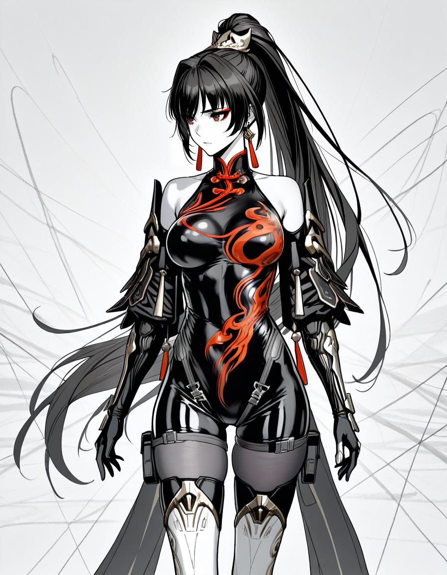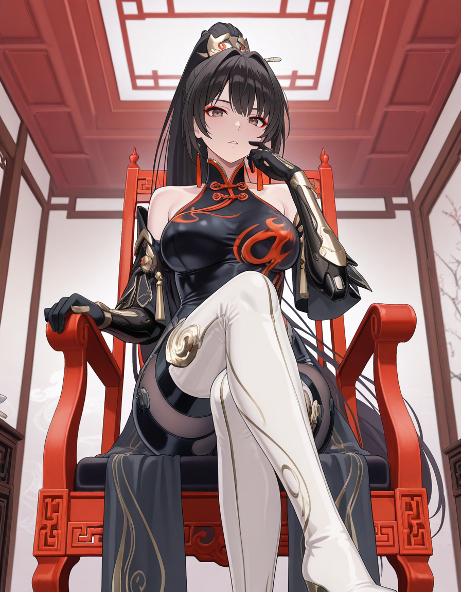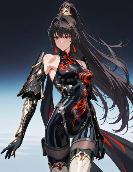 mai_pgr_qu_qm_lqgy,brown_eyes,red_eyeshadow,very_long_hair,high_ponytail,black_hair,mature_female,(aged_up:1.5),hair_ornament,bodysuit,bare_shoulders,gloves,mechanical_arms,pantyhose,boots,black_bodysuit,chinese_clothes,thigh_boots,white_footwear,tassel,gold_trim,holding_sword