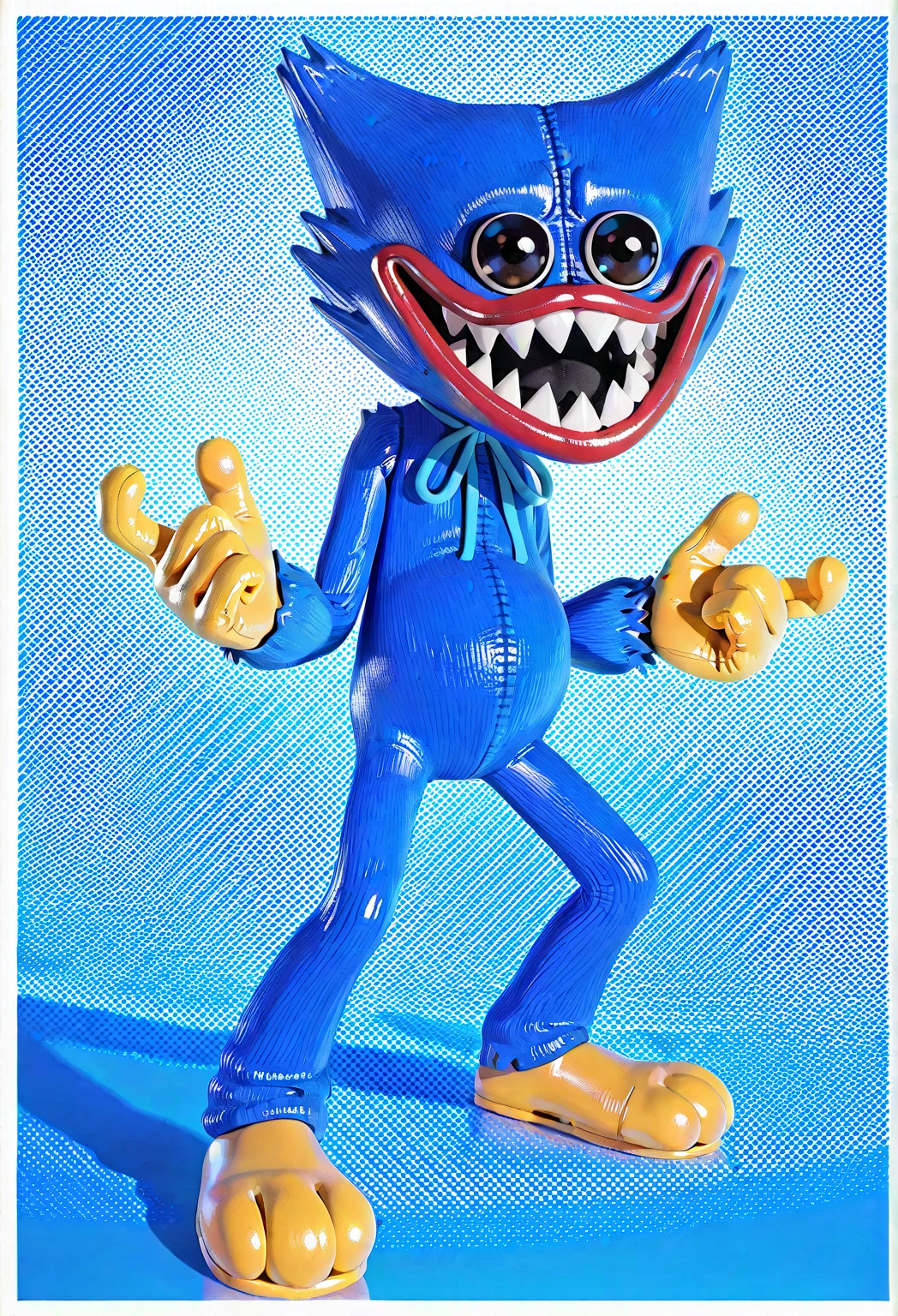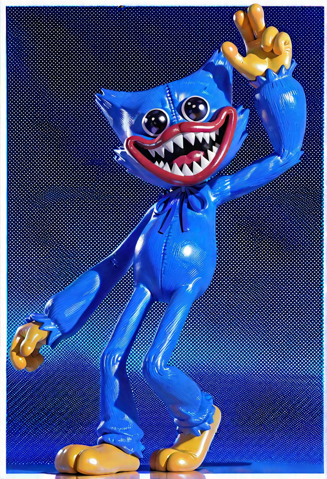 HuggyWuggyFNFC, 1boy, long limbs, blue body, blue fur, sharp teeth, large blue neck ribbon, dark red lips, red lips, plump lips, large black eyes, yellow fingers, yellow feet, 3d render, huggy wuggy,