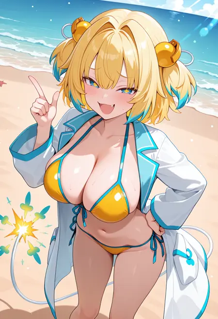 - 黄色比基尼, 两侧向上, 发饰, 蓝色镶边, 侧绑比基尼, 尾巴装饰, 引信尾巴, 点燃的引信, 实验室外套, 开襟外套,